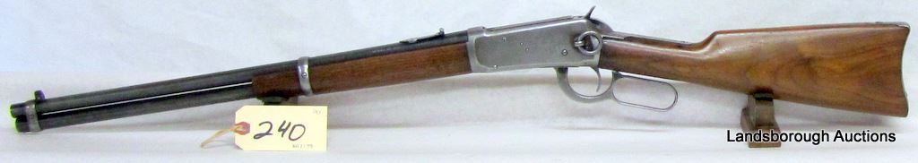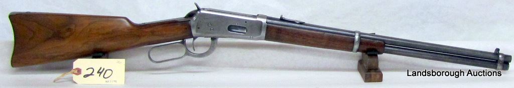 NON-RESTRICTED, LEVER ACTION, 32 WS, 20" BARREL, SN 985083. WOOD BUTT STOCK REPAIRED AND REFINISHED, BLUING BARE OR GREY, BORE VERY GOOD. MFD 1926. BROKEN LEAF ON BACK SIGHT.