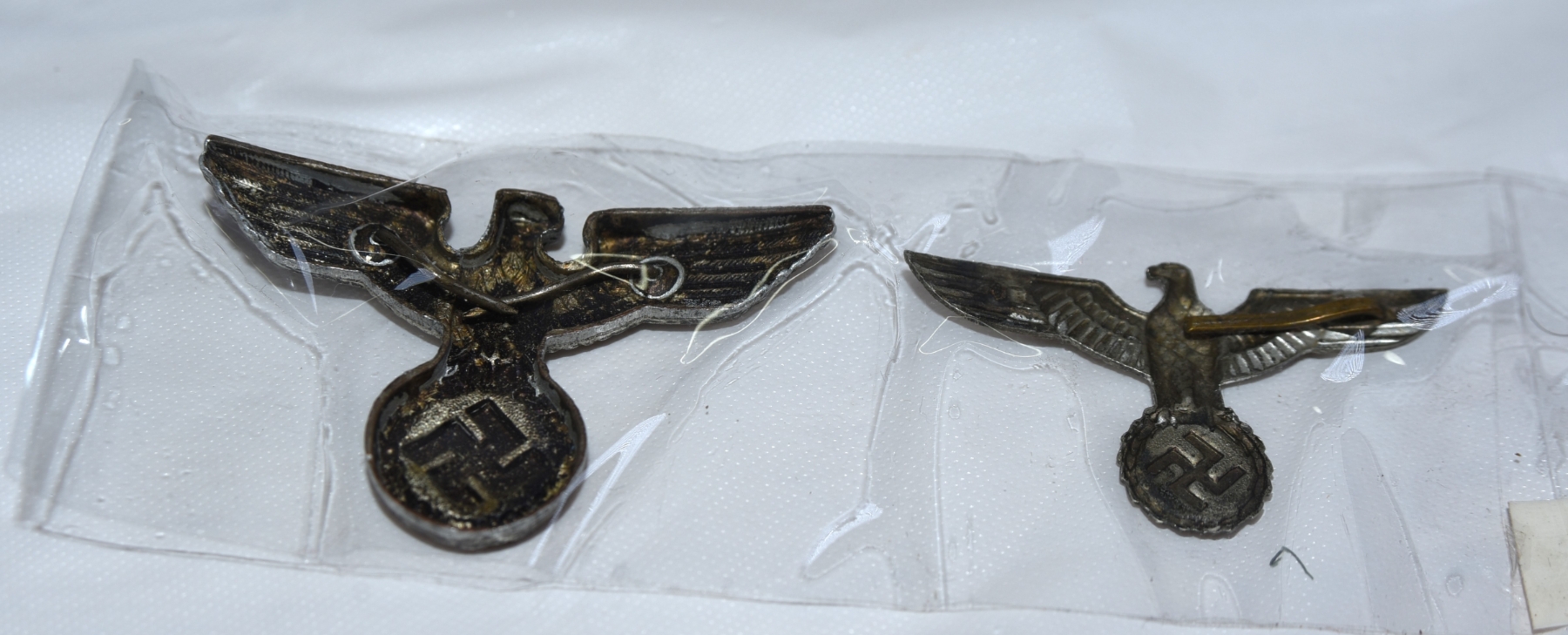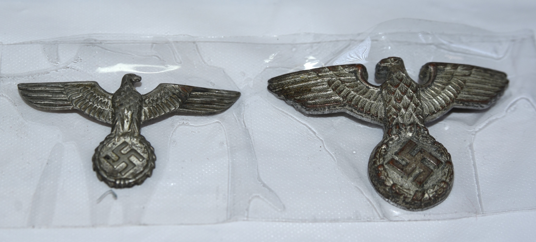 Pair of German WWII-era metal eagle cap insignia badges, likely uniform-mounted pieces featuring the spread-wing eagle over wreath design.