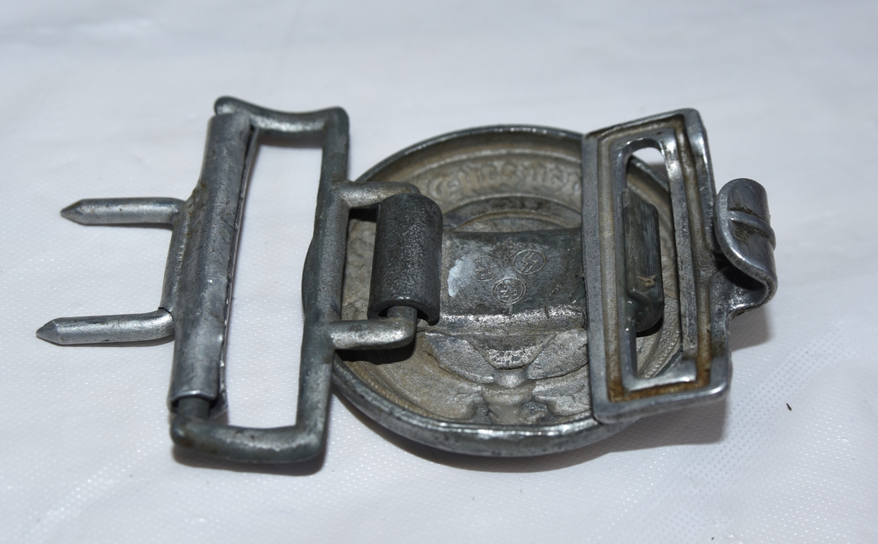 This example appears to be constructed of zinc or steel with a field-grey/silver finish, showing moderate wear and age-related patina. The front retains visible detail in the eagle and wreath, though some softening is present from use and ageReverse shows complete hardware including prongs, catch, and hinge assembly, all intact. Interior markings are visible but faint, with areas of oxidation and finish loss consistent with period use.