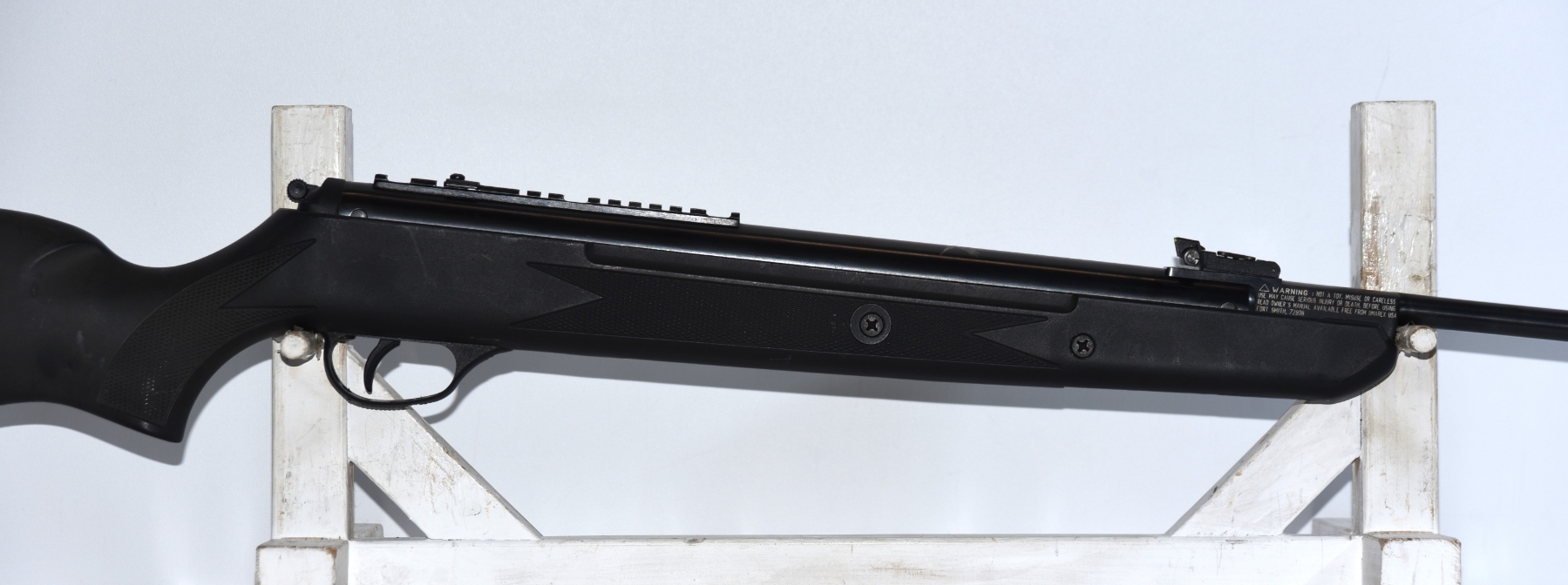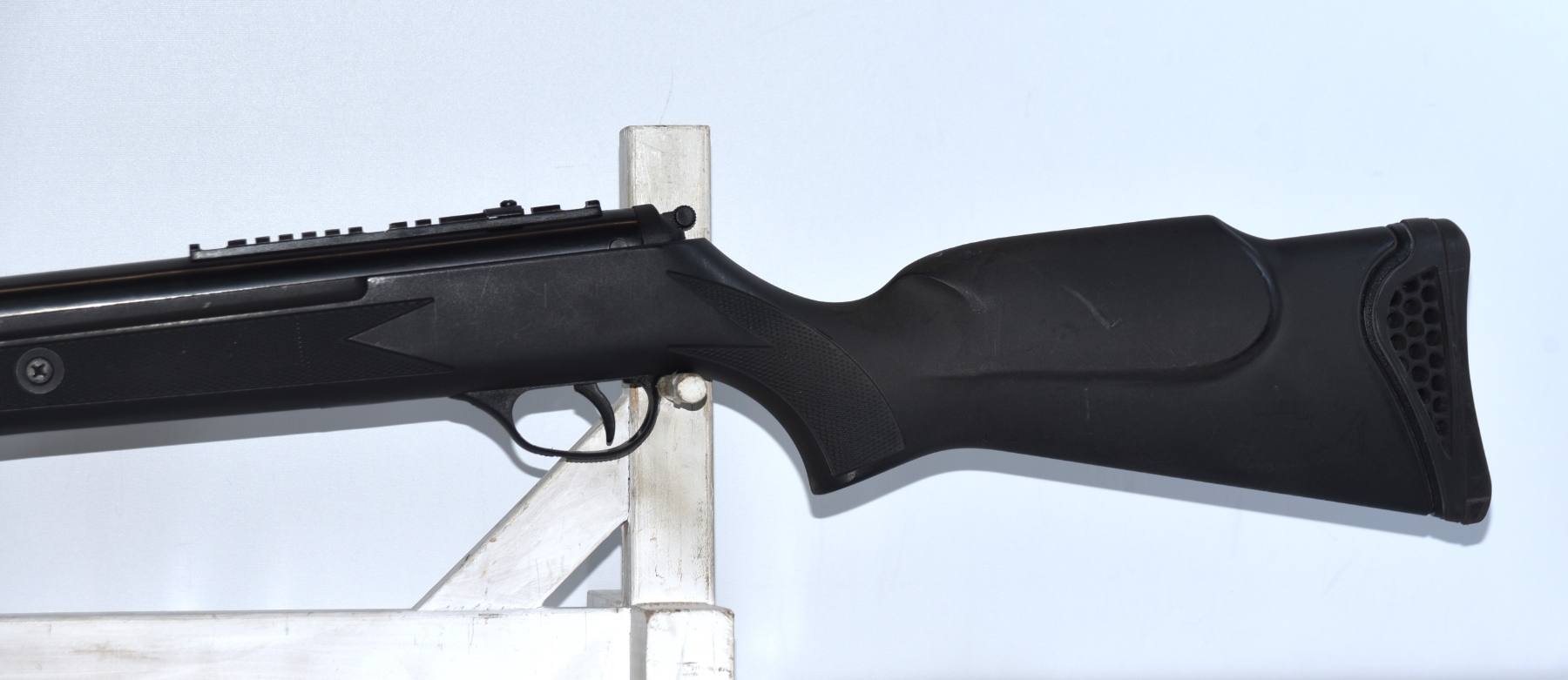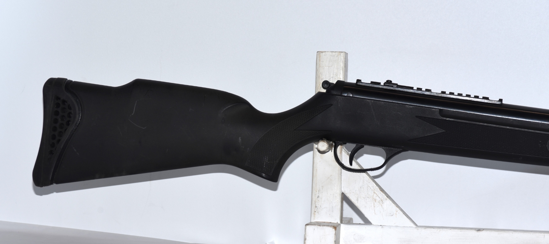 Synthetic stock shows light scratches and scuffs; condition is good.
