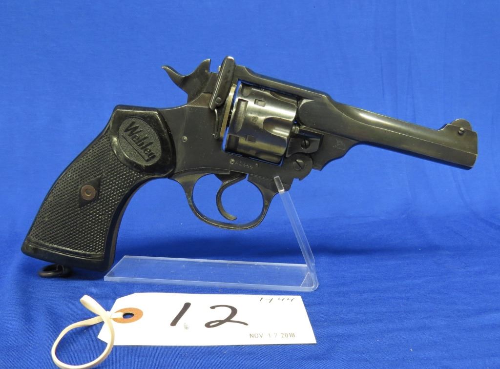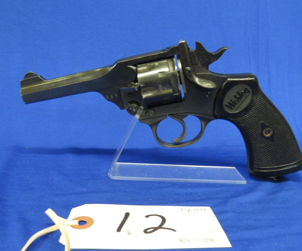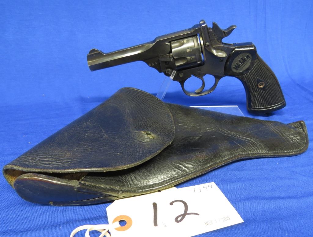 Prohibited, revolver, 38 S&W, 102mm barrel, SN A2455. Grips have marks and scratches, bluing has scratches and some pitting, bore excellent. Comes with black holster.