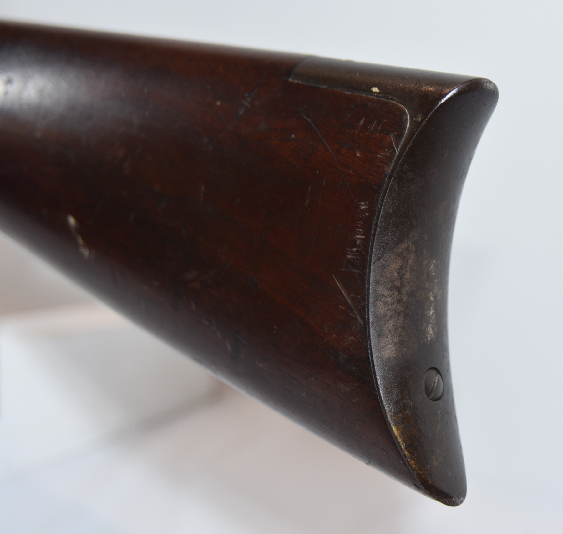 Wood stock shows scratches and scuffs, some dents in areas, small hairline cracks in the rear stock; condition is very good for age.