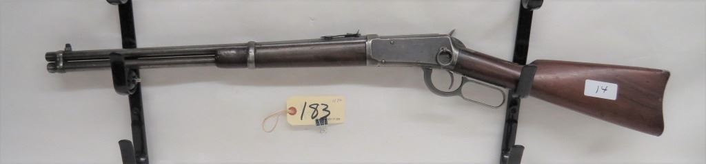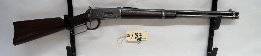 Non-restricted, lever action, cal. 30 wcf, 20" barrel, SN 447389, wood has cracks in fore end and rear stock, bluing is grey, bore is dark/stained rifling is good