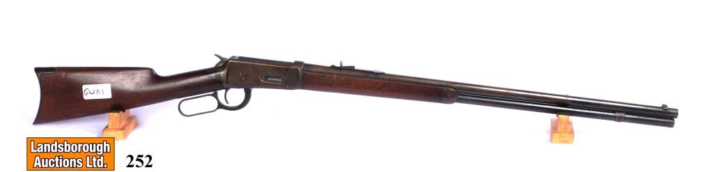 Non-Restricted, lever action, 38-55 Win, 26" barrel, SN 224745. Wood has gouges, scratches and a crack in forearm, bluing is brown, bore badly pitted, rifling evident.