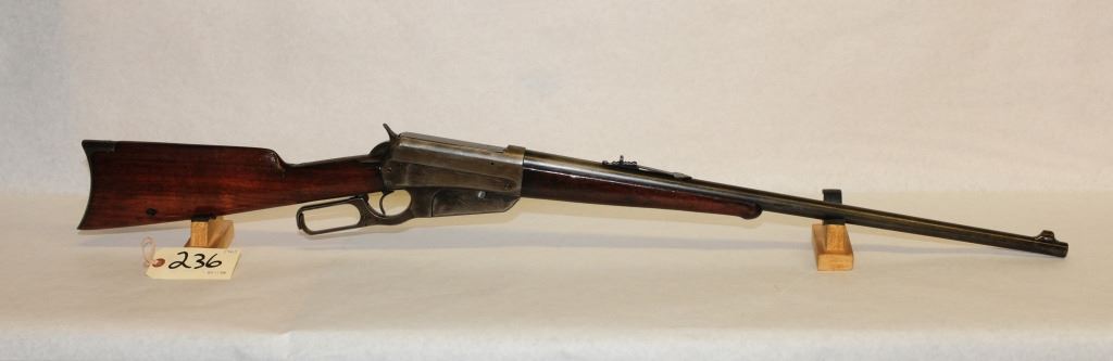 Non-restricted, lever action, .35 WCF, 24" barrel, SN 56970, wood has a small chip out of butt stock by hammer on right side and some handling marks, butt stock has had a 3/8" hole drilled through it, bluing is turning grey, bore is good, has a couple marks on end of muzzle