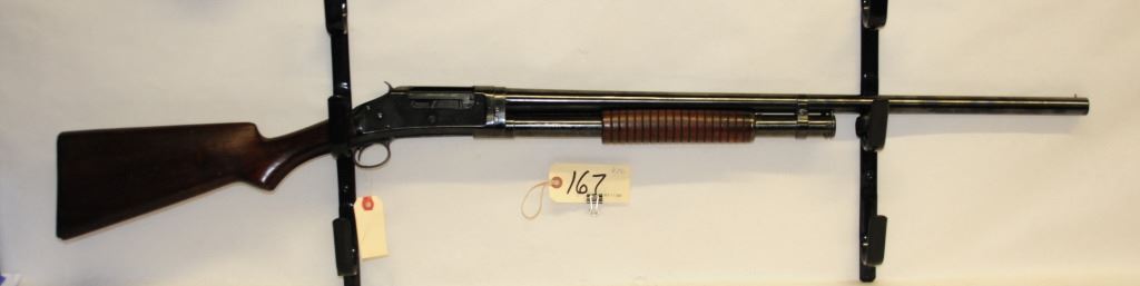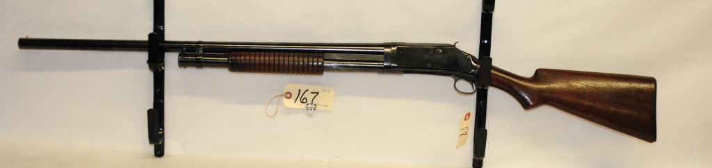Non-restricted, pump action, 12 ga. 2 3/4", 28" mod. barrel, SN 545218, wood has handling marks and a crack behind the receiver on the right side, bluing is good, bore has some pitting