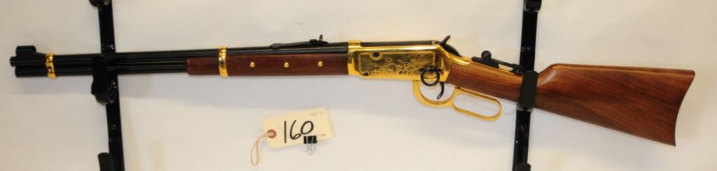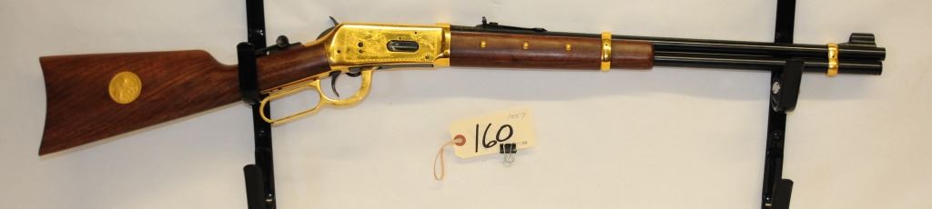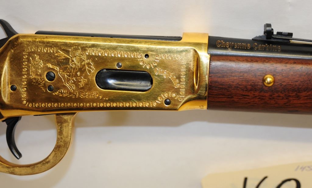 Non-restricted, lever action, cal. 44-40 win., 19 1/2" barrel, SN CH01345, wood has 3 small dints on rear stock, bluing has a very, very light 3" mark/scratch on left side of barrel, gold plating has some tarnishing, some rust around the gate, bore is excellent
