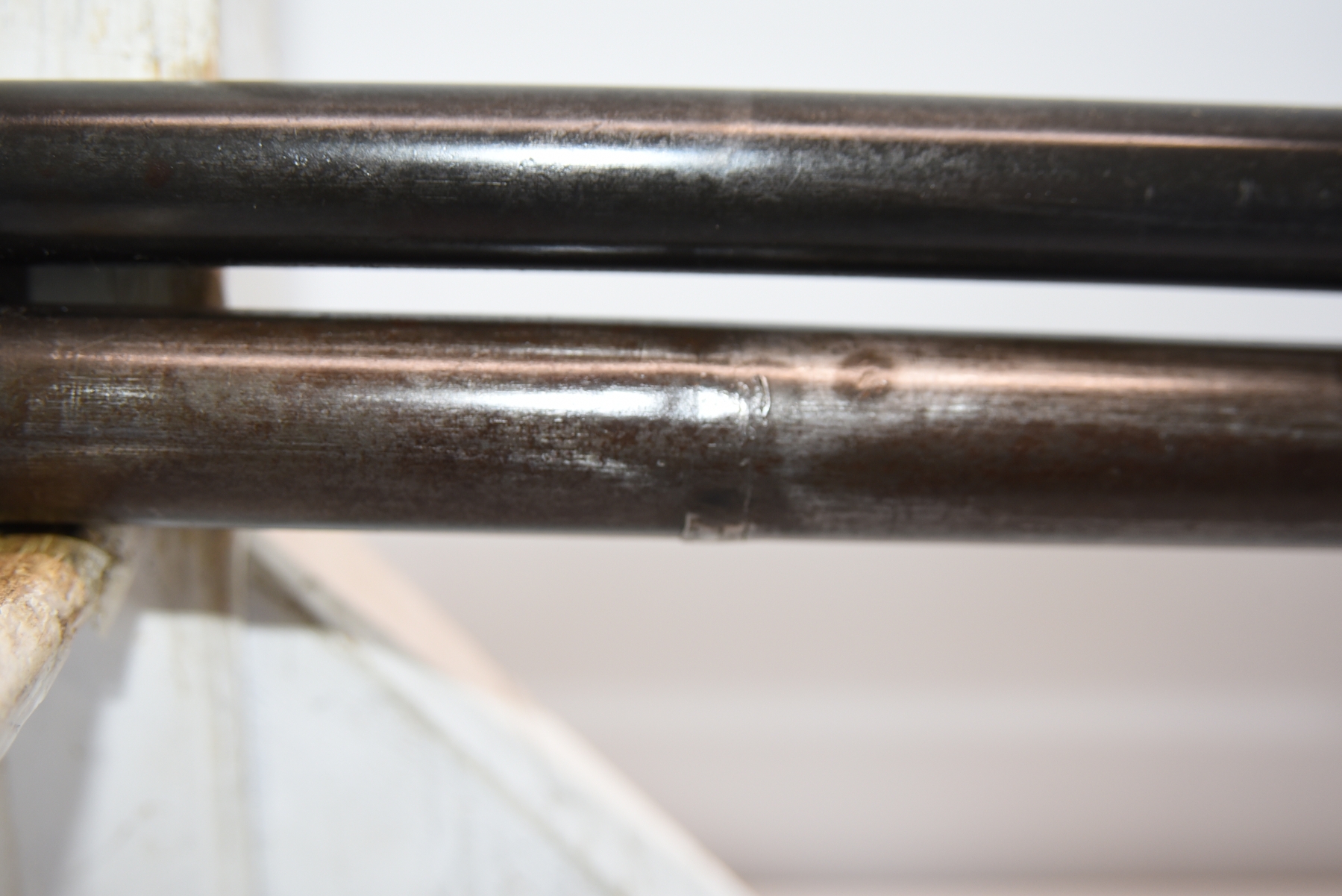 Wood stock shows a broken/missing piece of the butt plate, scratches, scuffs, light dents, few tiny chips in the forearm; condition is good.