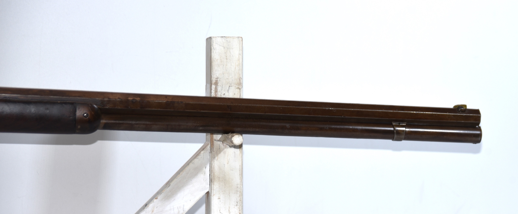 Wood stock shows scratches, scuffs, dents, some light chips, few small cracks; condition is good for age.
