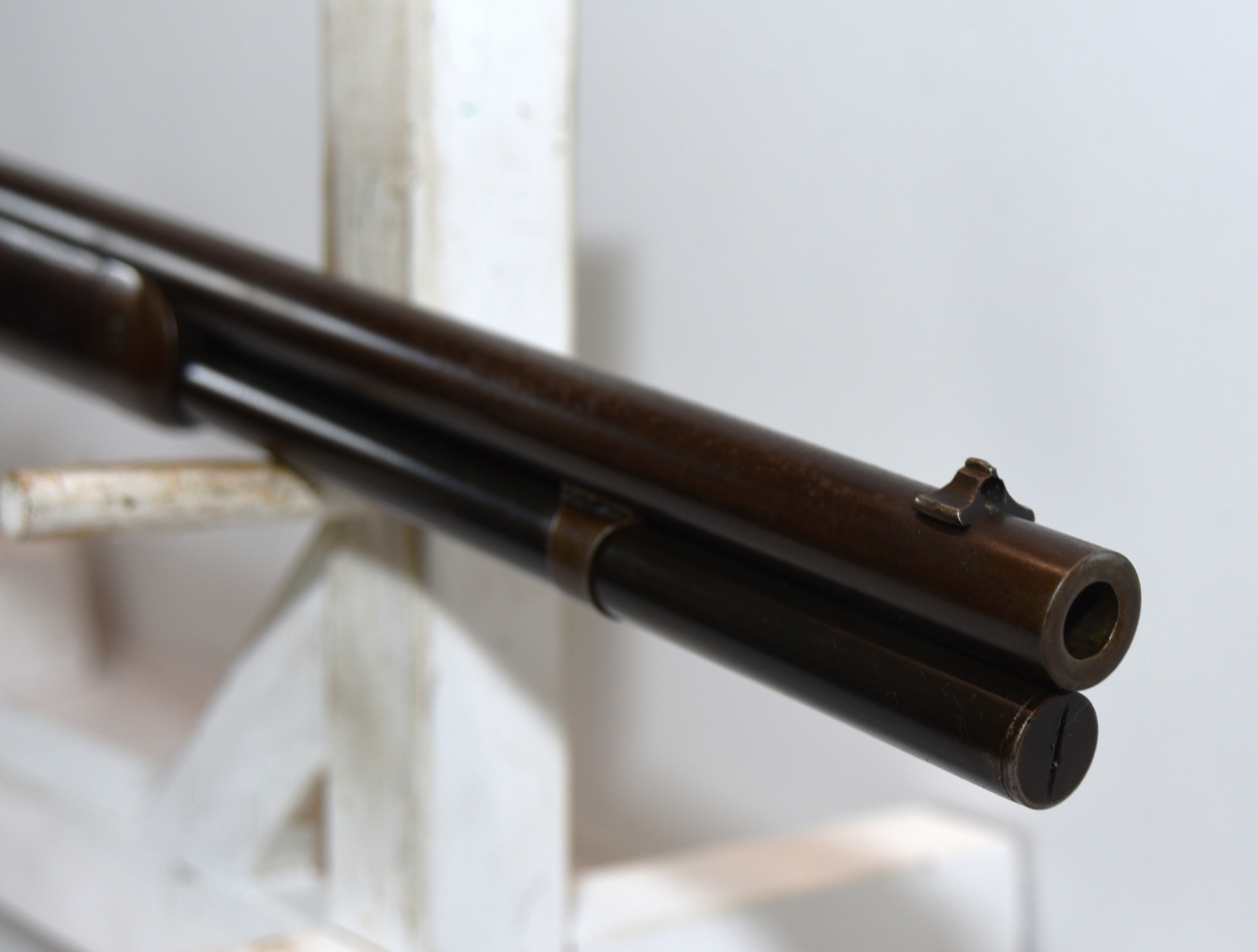Bore is shiny with light fine pitting in areas and very good rifling for age. Condition is good for age.