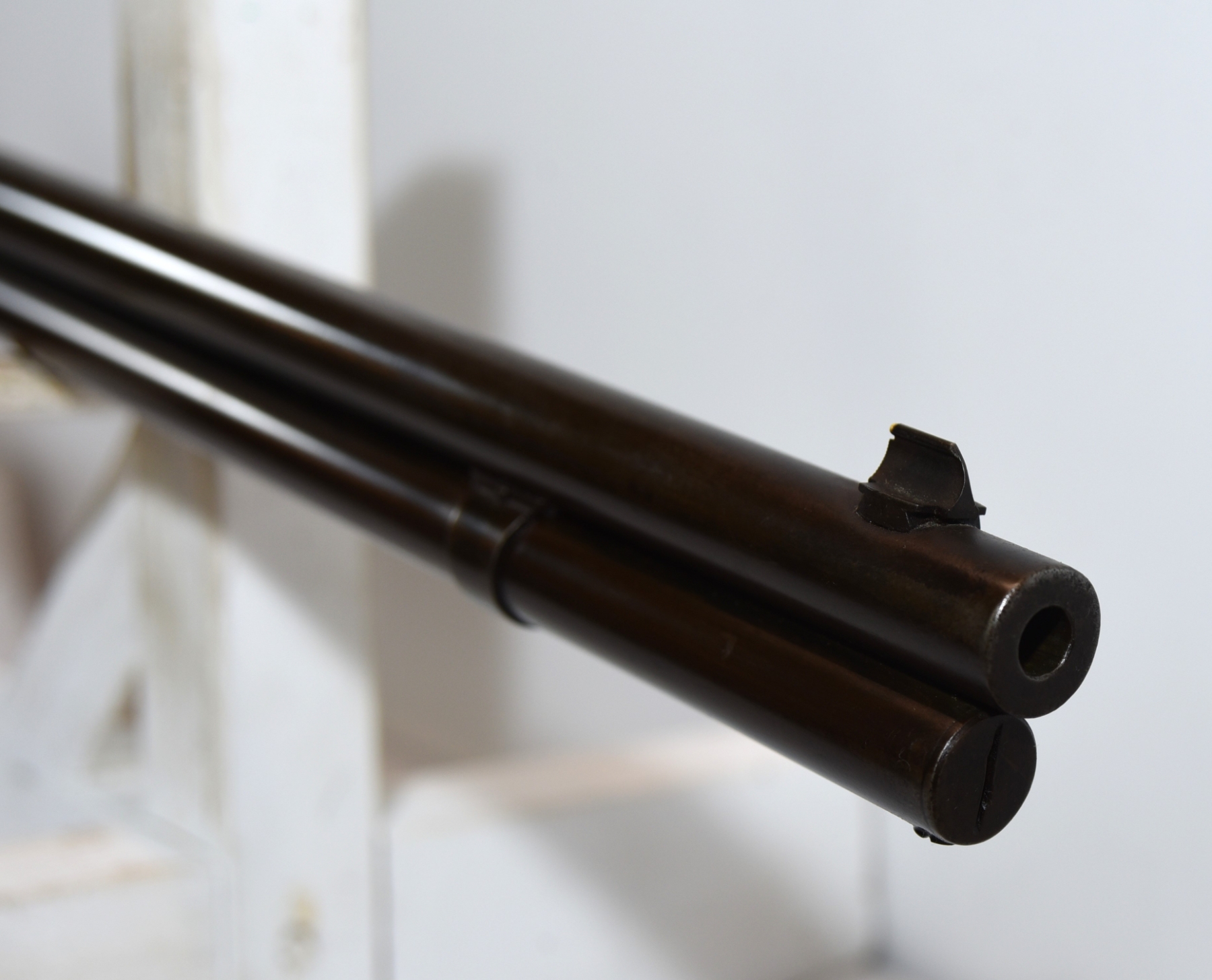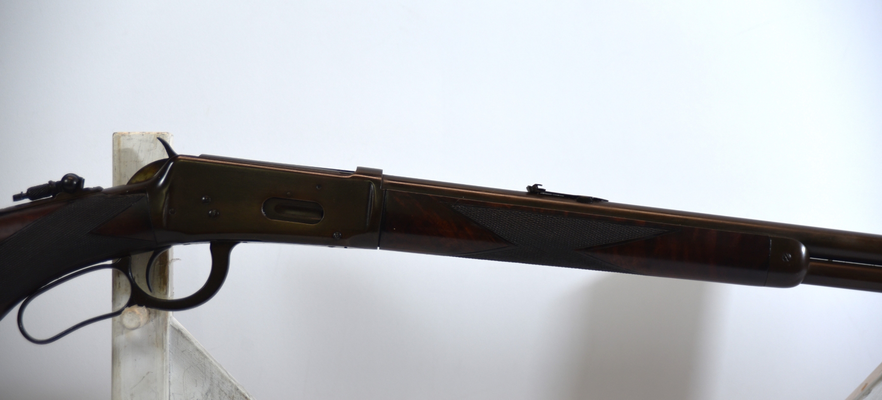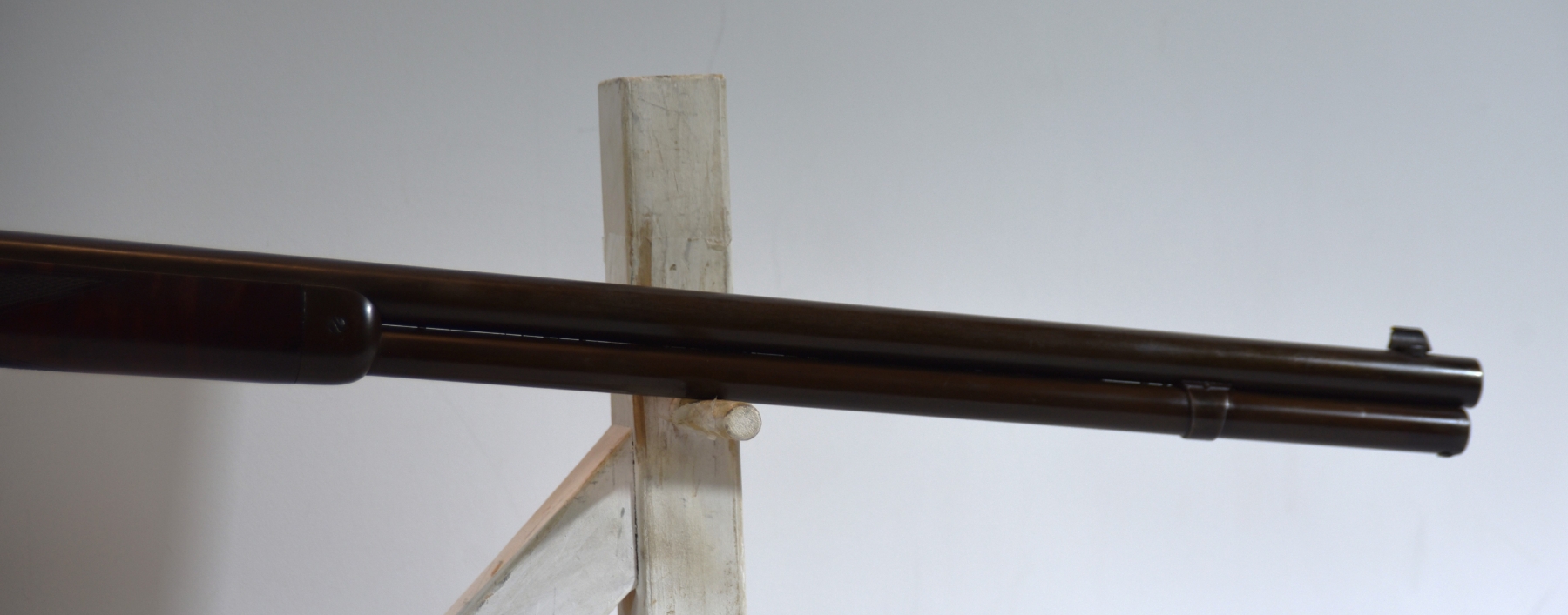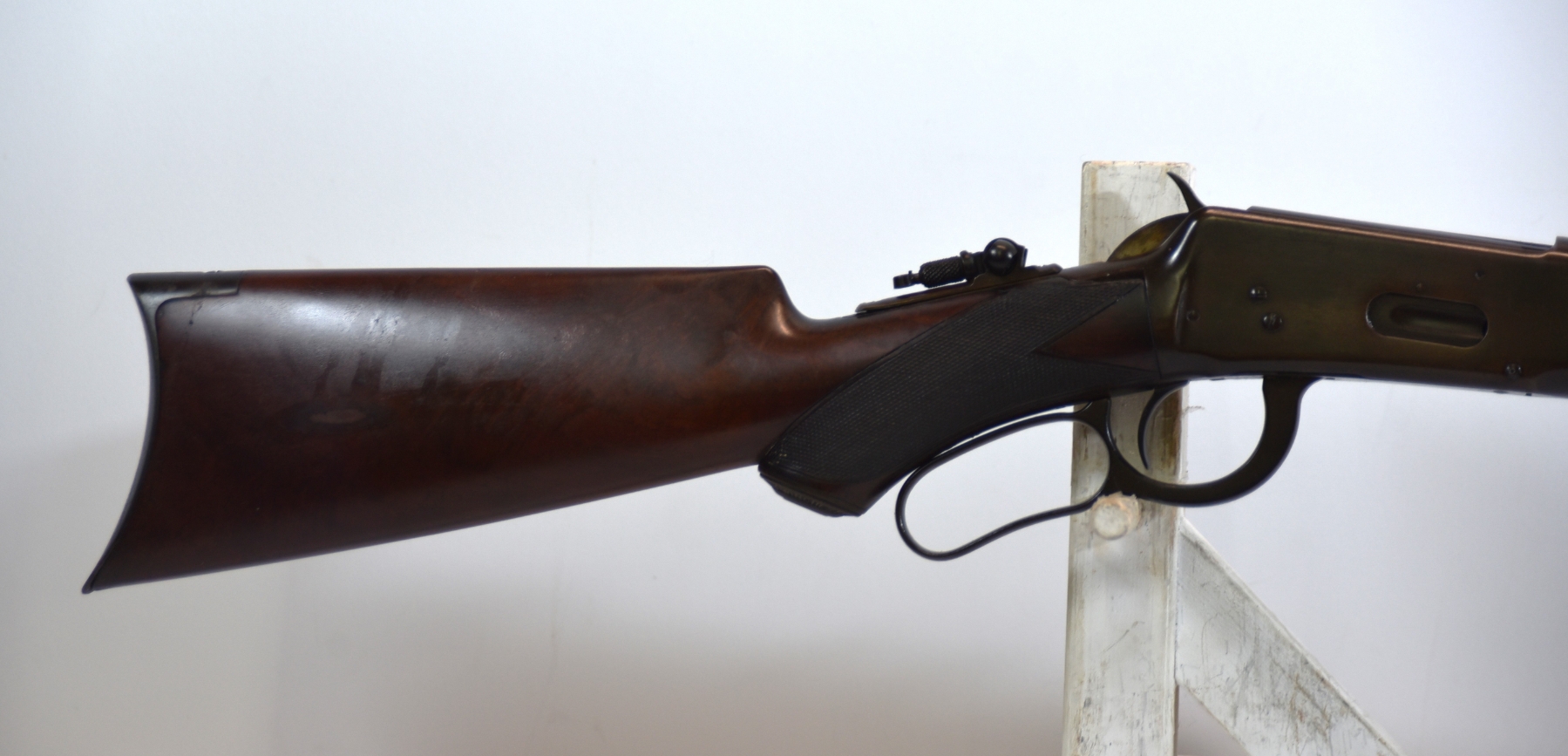 Wood stock shows very nice checkering, there are scratches, scuffs, few light dents, rear stock shows two small chips on the right side of upper tang, a small chip at heel of the stock, there is a finish wear mark on the rear stock; condition is very good for age.