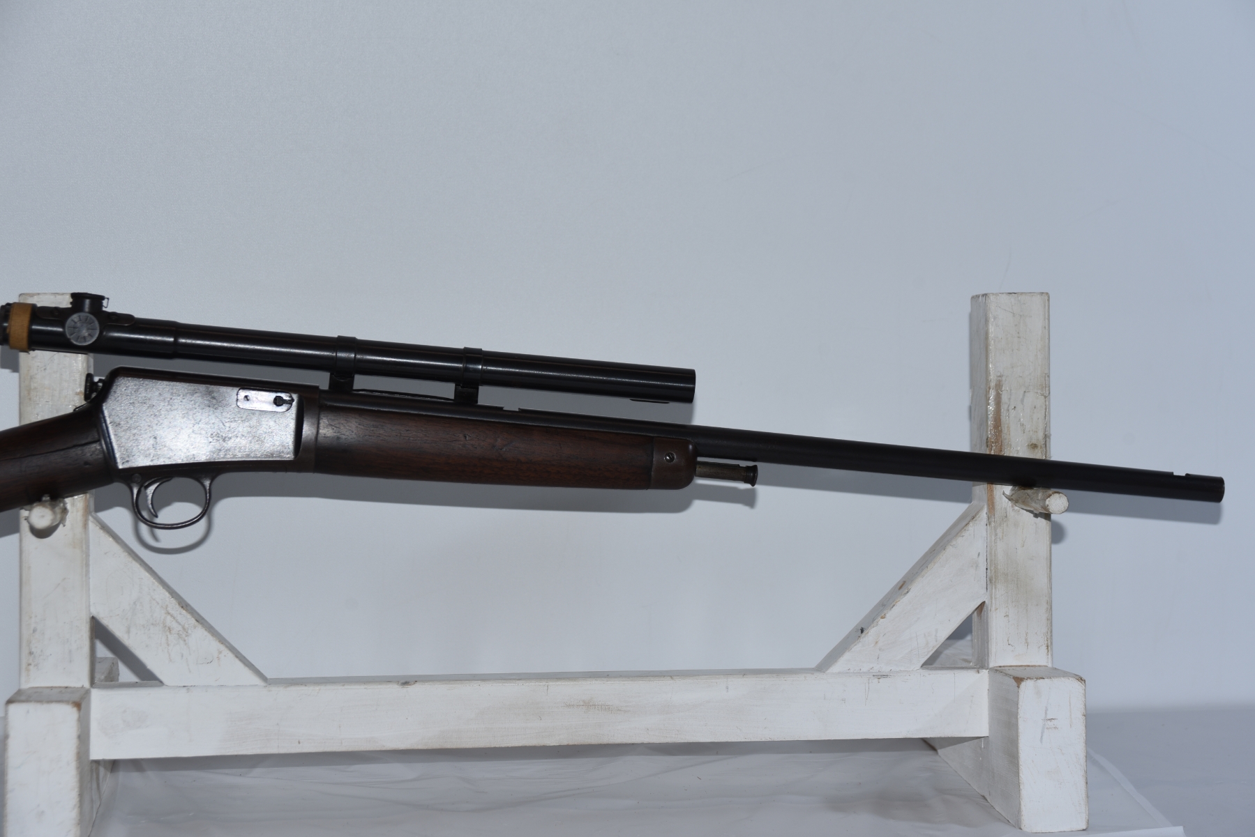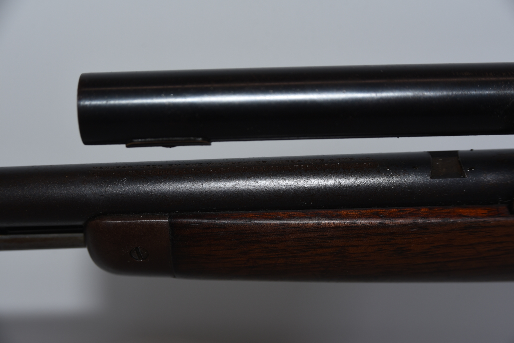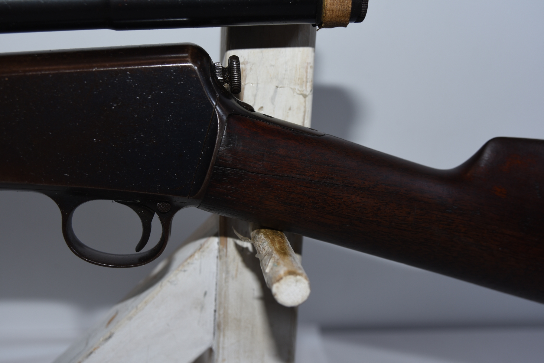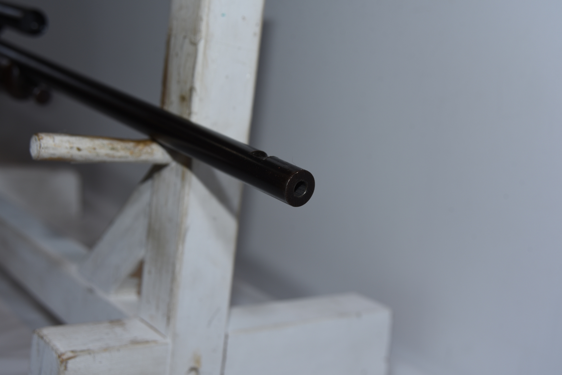 Wood stock shows a crack on the rear stock, there are scratches, scuffs, light dents, finish wear; condition is less than fair.