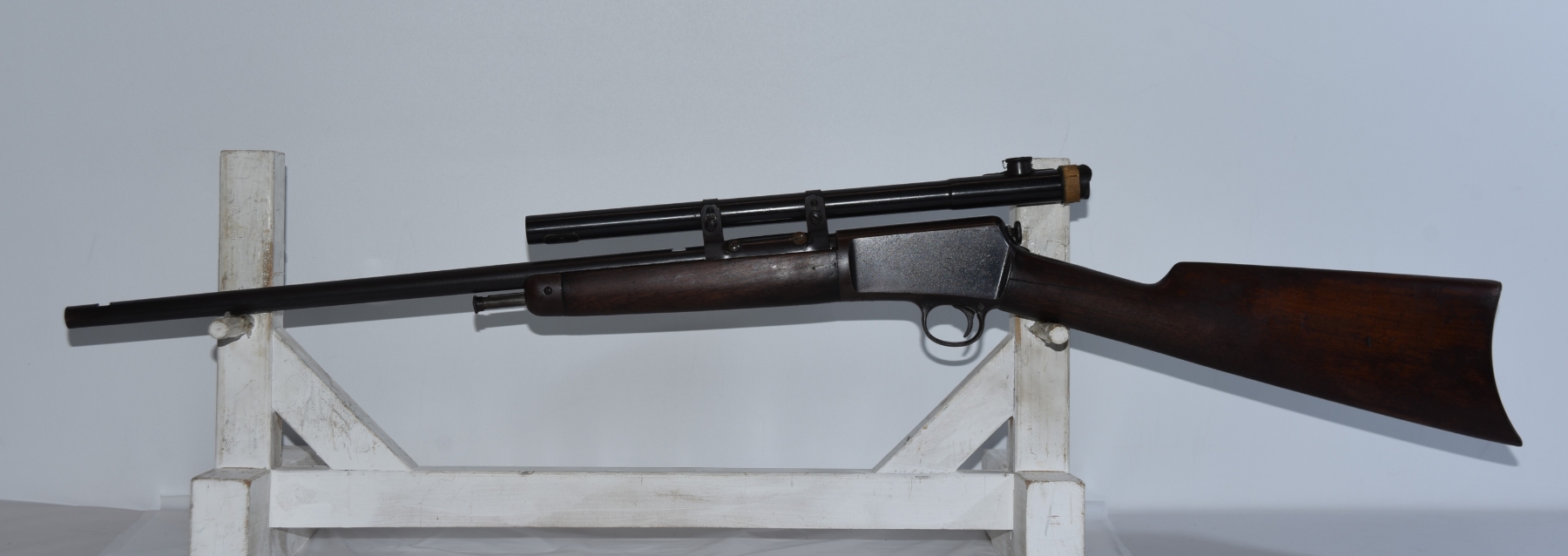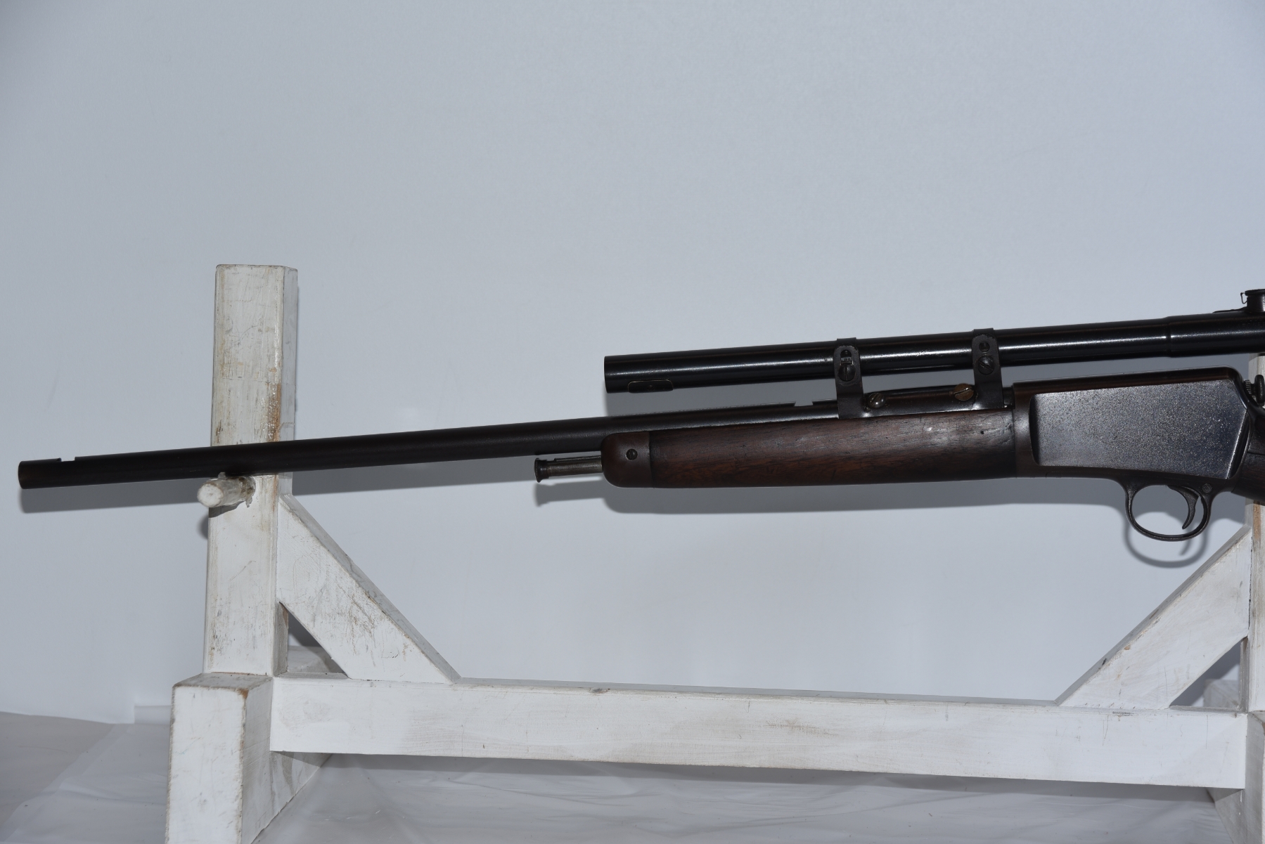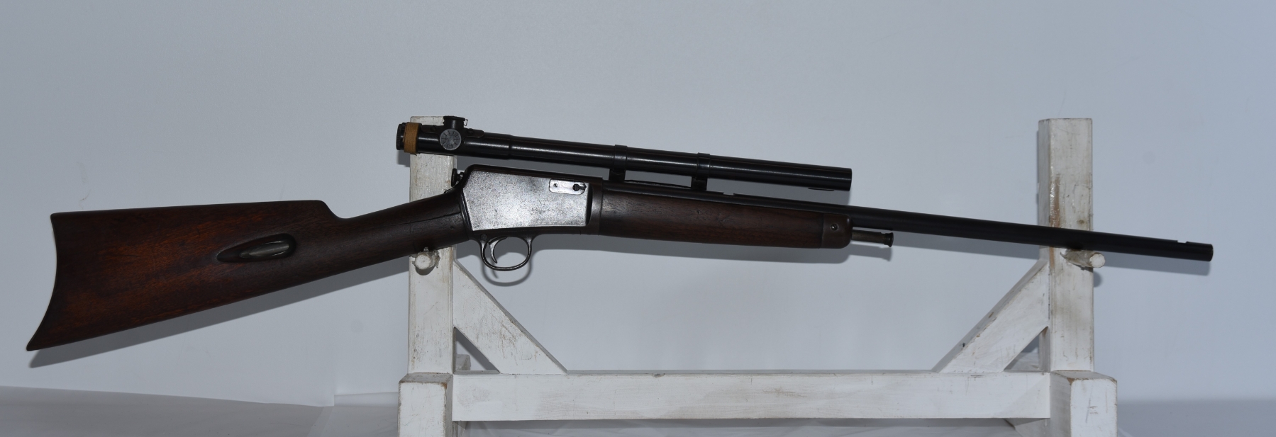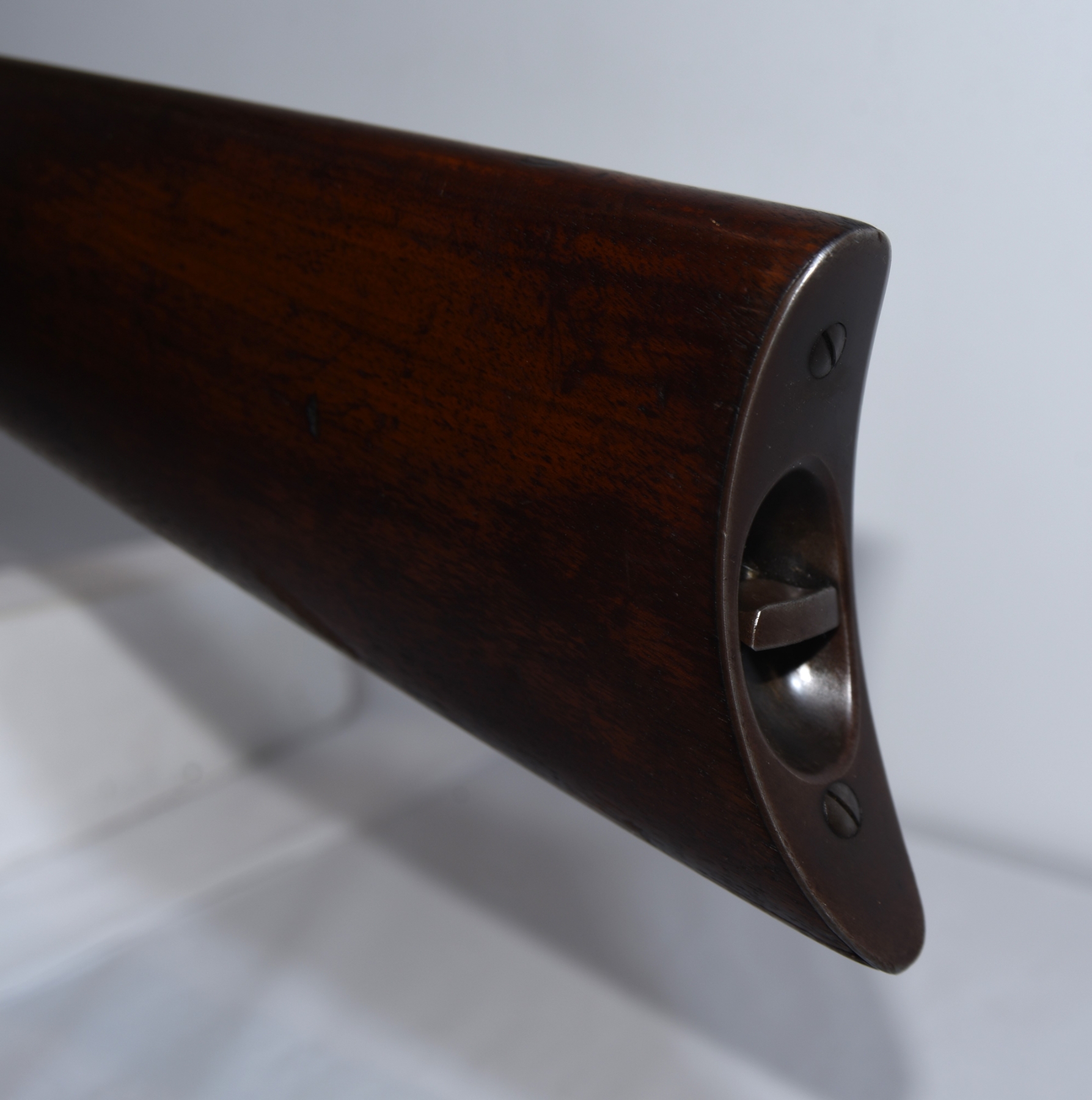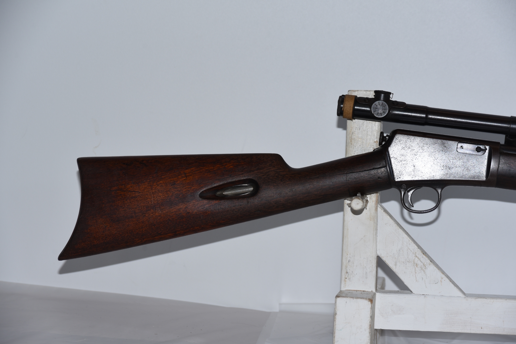 Wood stock shows a crack on the rear stock, there are scratches, scuffs, light dents, finish wear; condition is less than fair.