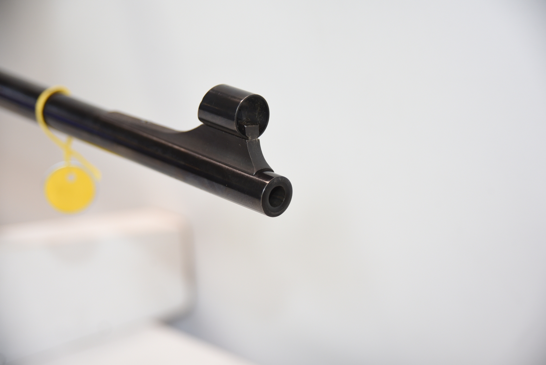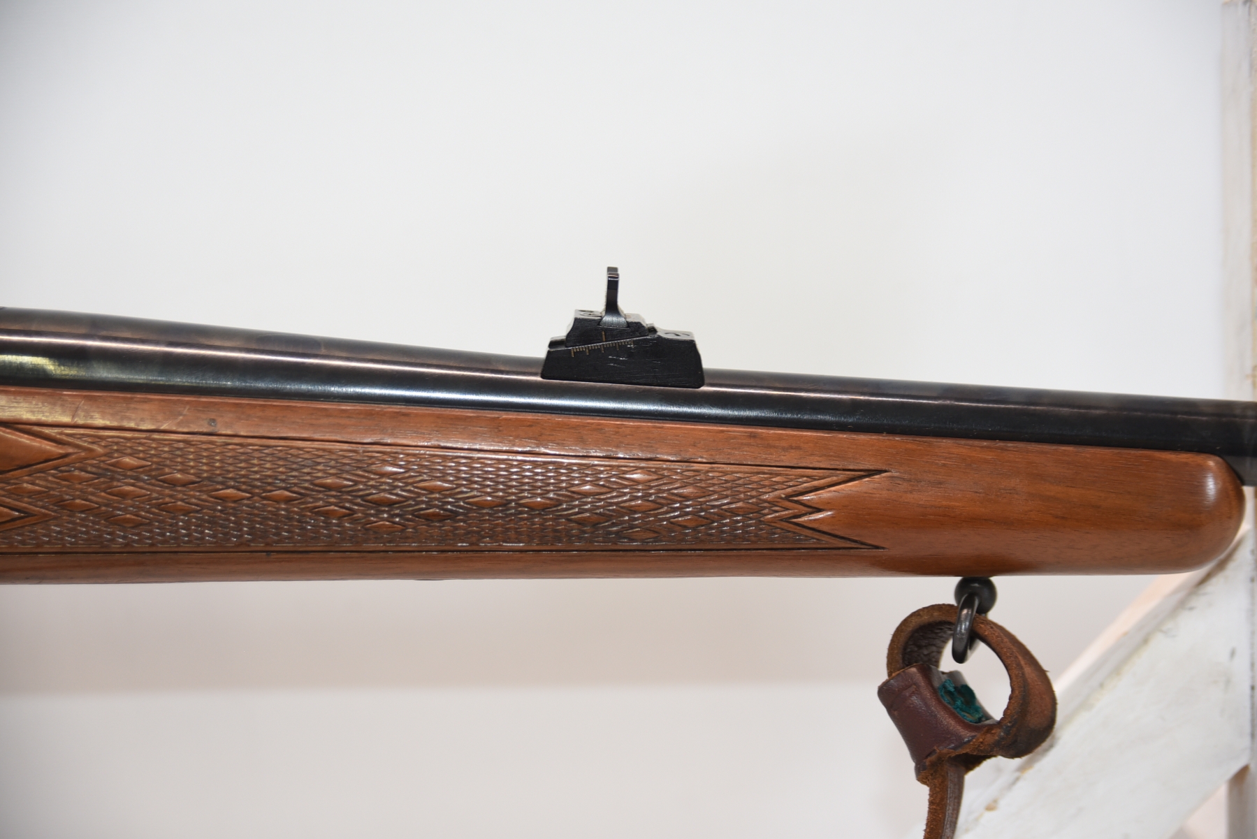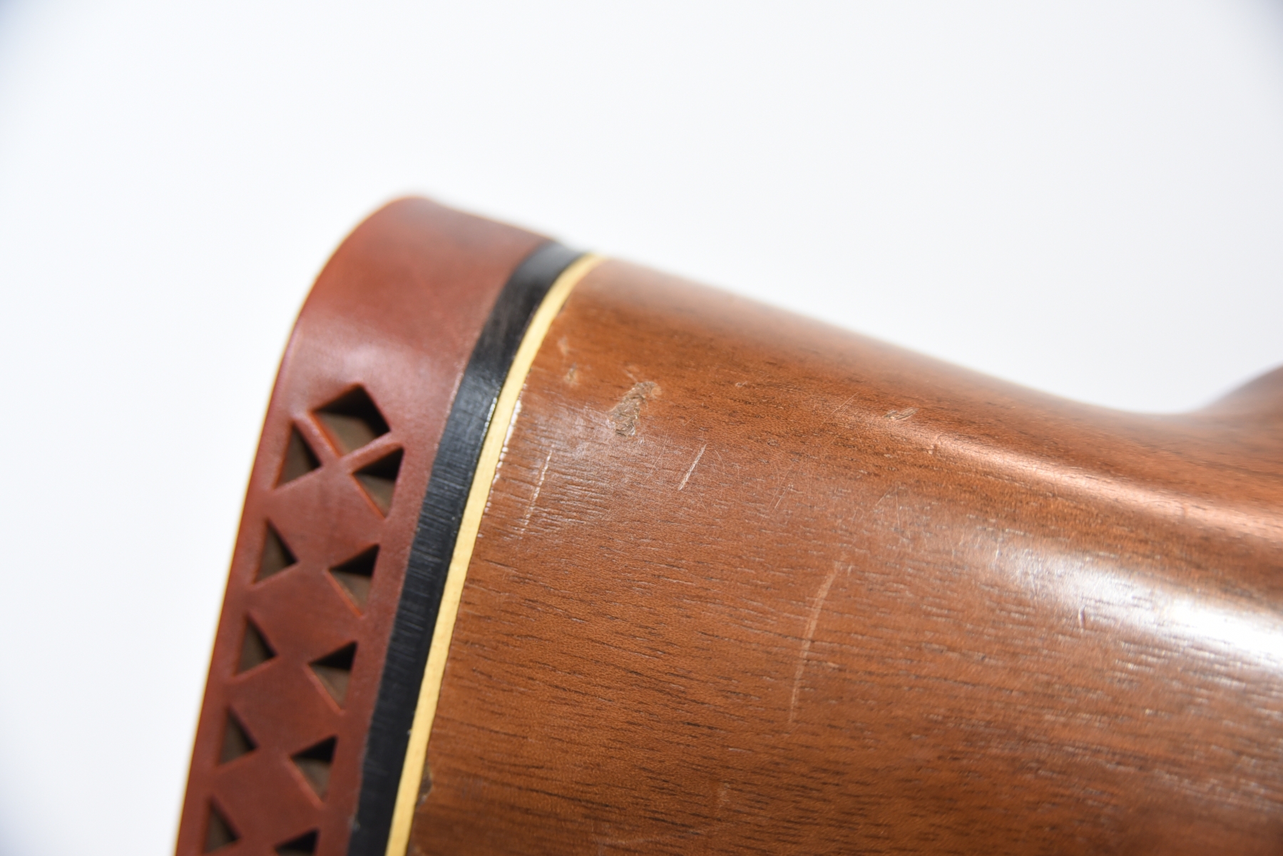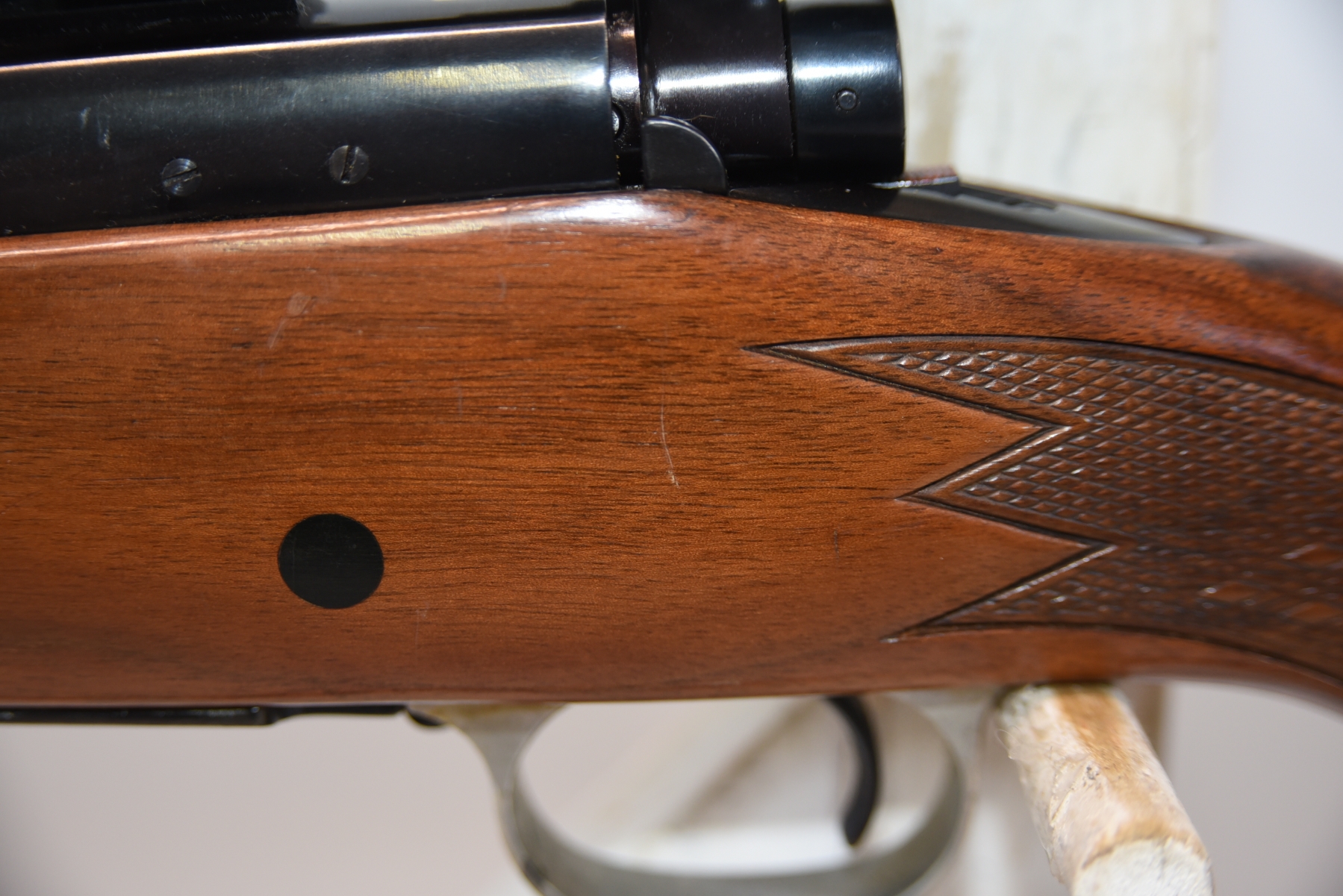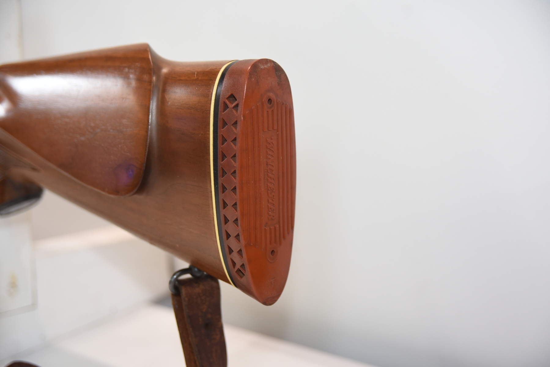 The wooden stock has a number of scratches and dents on both sides as well as the top and underneath. The wooden forearm has some scratches. The bluing is shiny and has some scratches. There is scratches and paint chipping on the trigger guard. Comes with a leather sling attached. Comes with a Bushnell Scopechief IV 1.5x - 4.5x attached. The scope is shiny but does have some scratching. Scope is clear to look through. Scope does not have any lens covers. The bore is shiny and does have visible rifling, in very good condition.