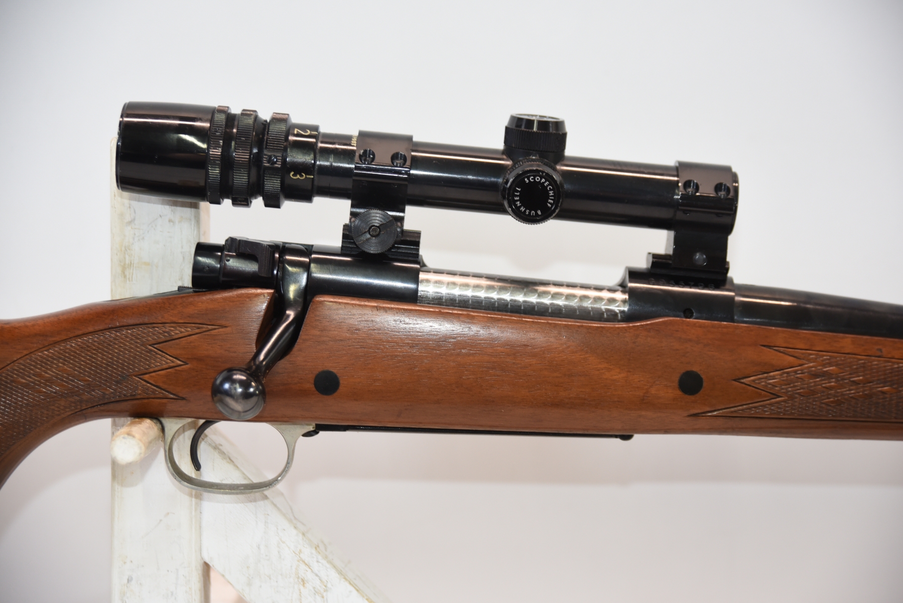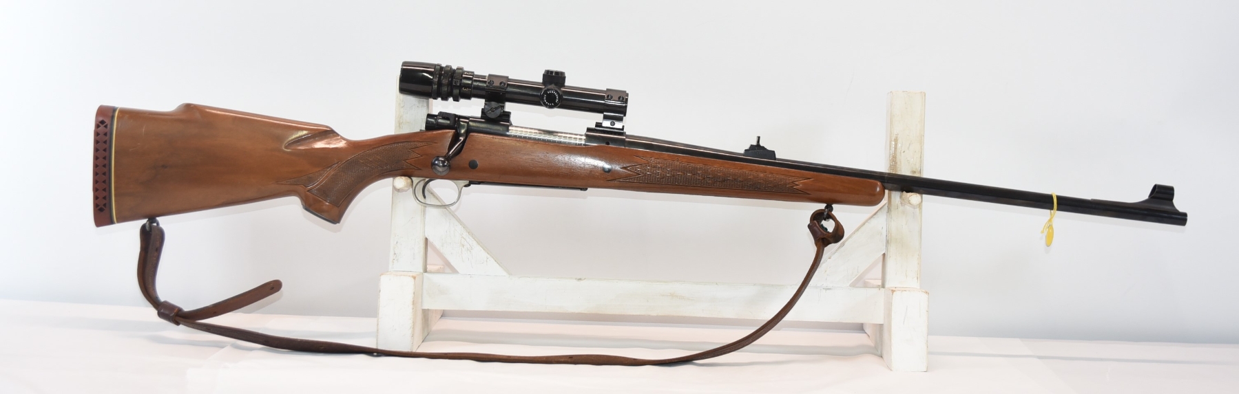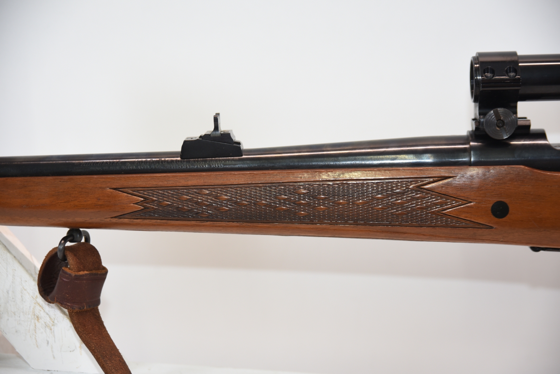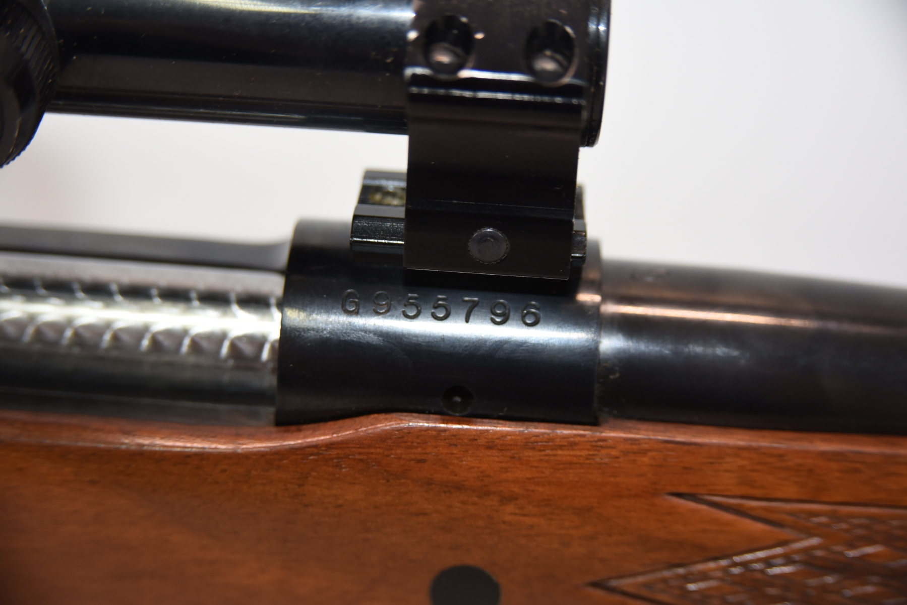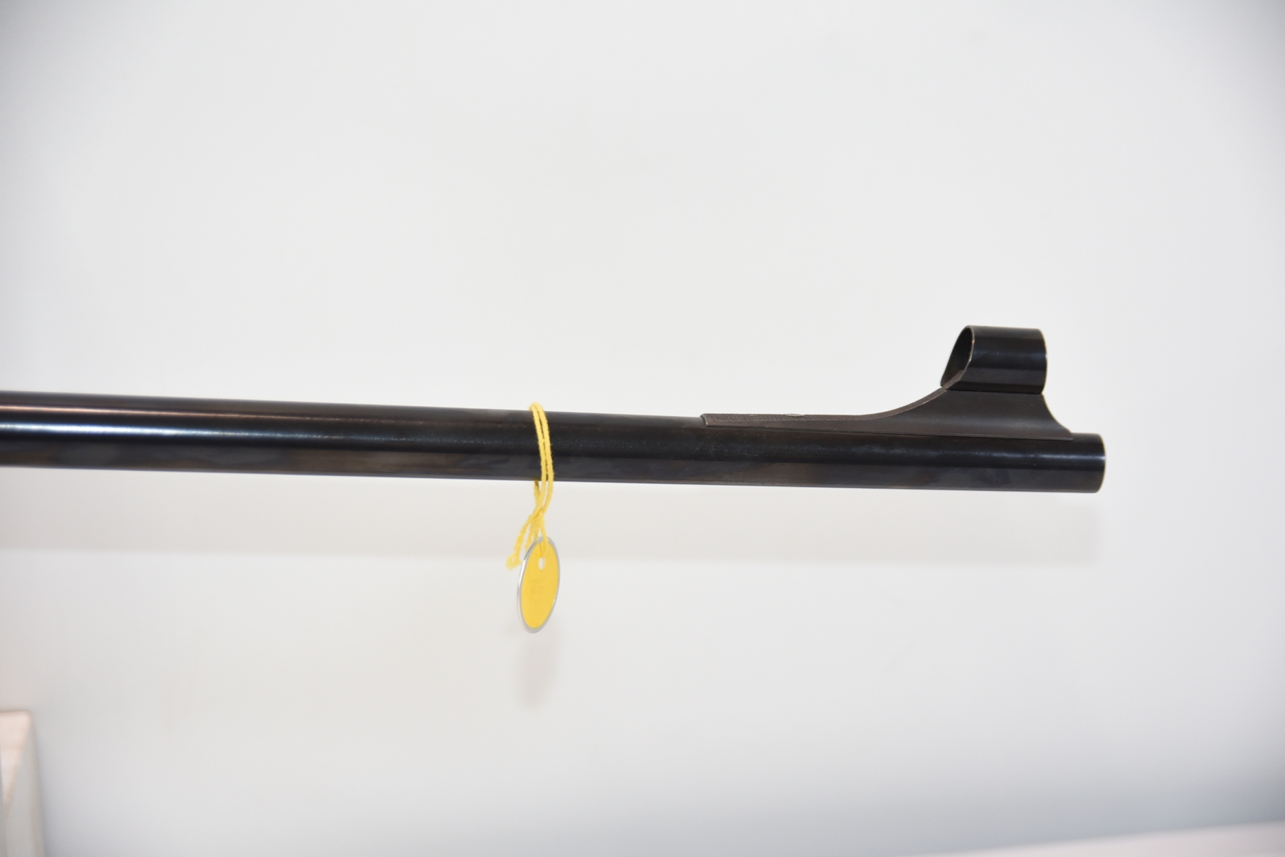 The wooden stock has a number of scratches and dents on both sides as well as the top and underneath. The wooden forearm has some scratches. The bluing is shiny and has some scratches. There is scratches and paint chipping on the trigger guard. Comes with a leather sling attached. Comes with a Bushnell Scopechief IV 1.5x - 4.5x attached. The scope is shiny but does have some scratching. Scope is clear to look through. Scope does not have any lens covers. The bore is shiny and does have visible rifling, in very good condition.
