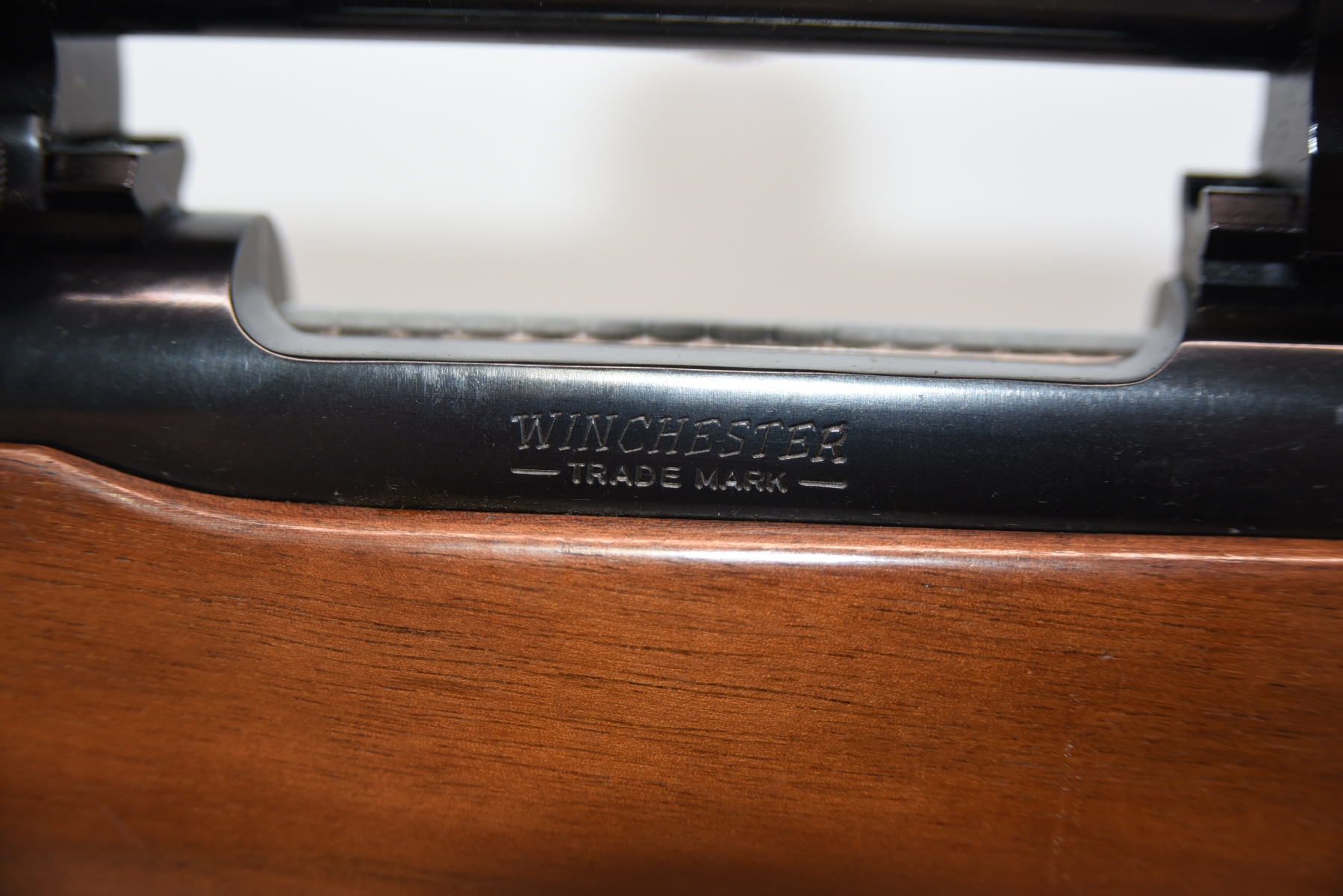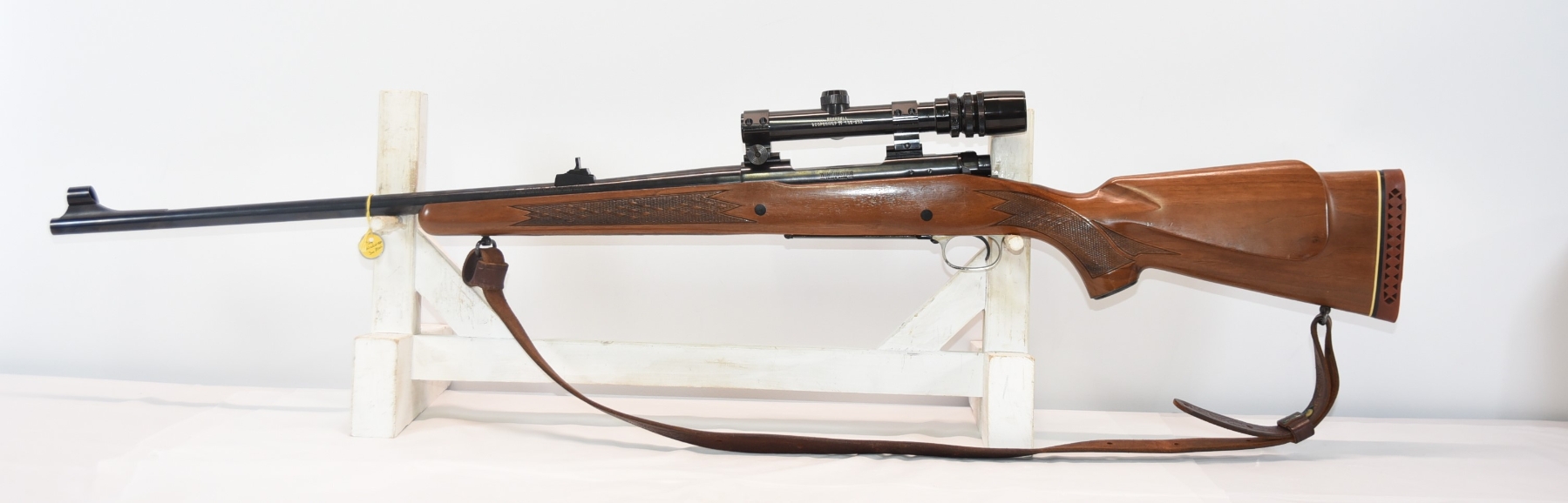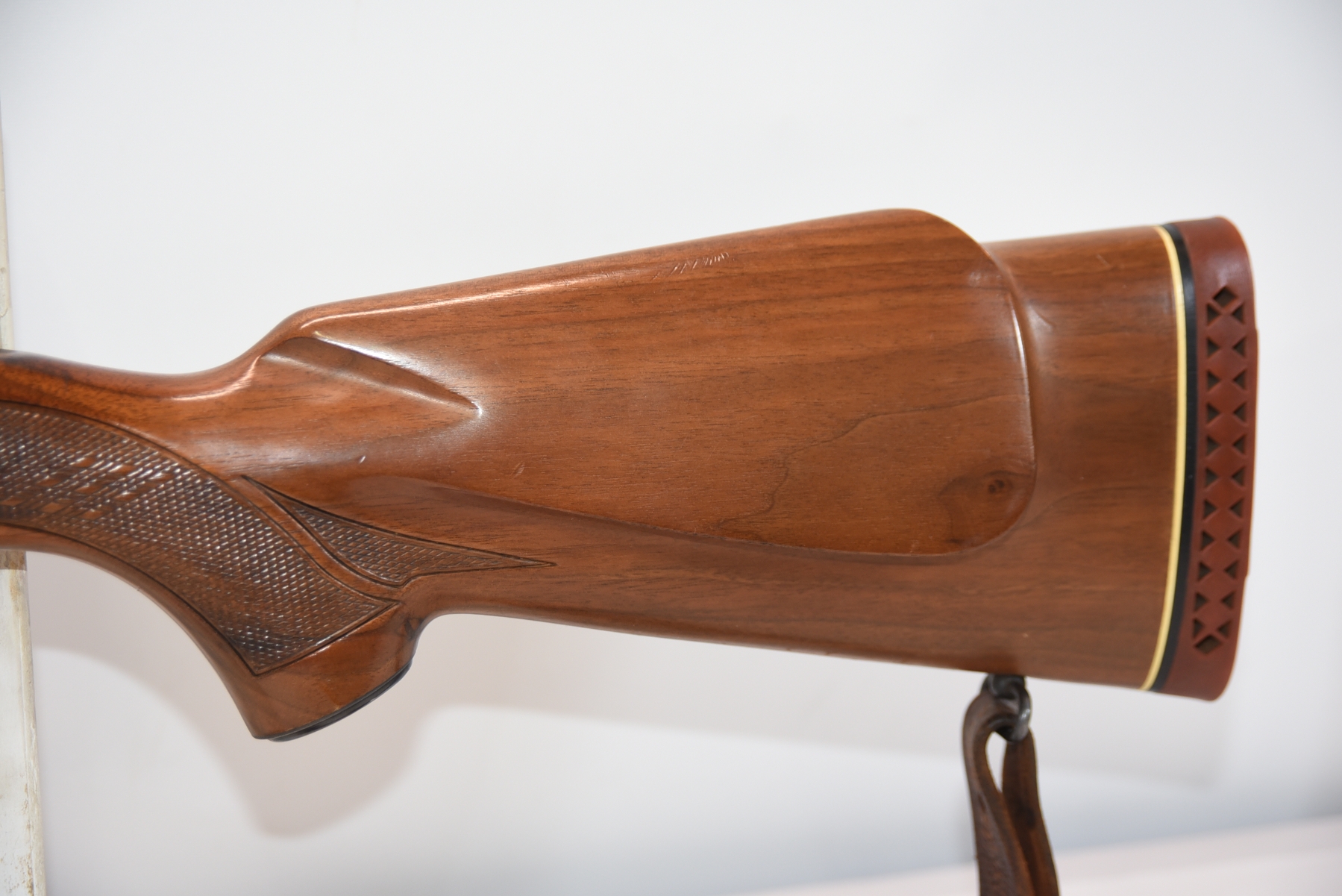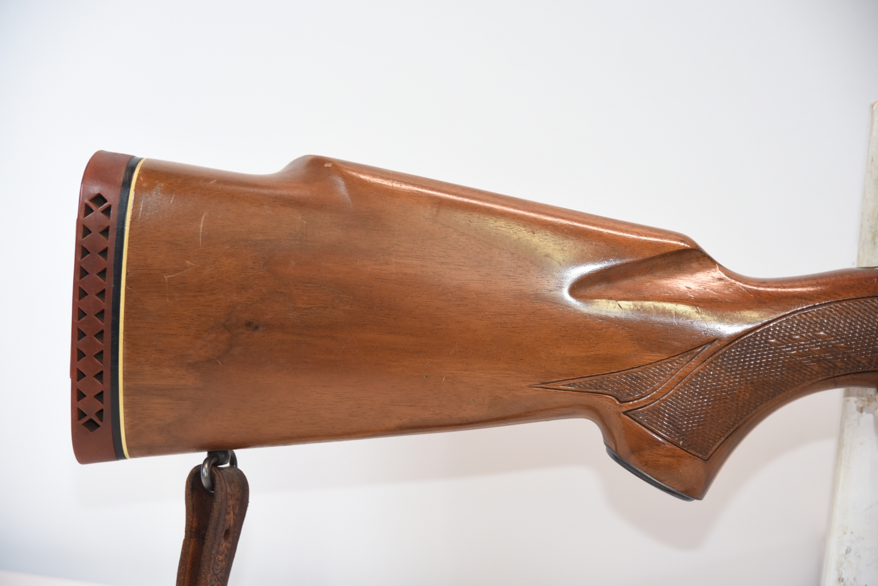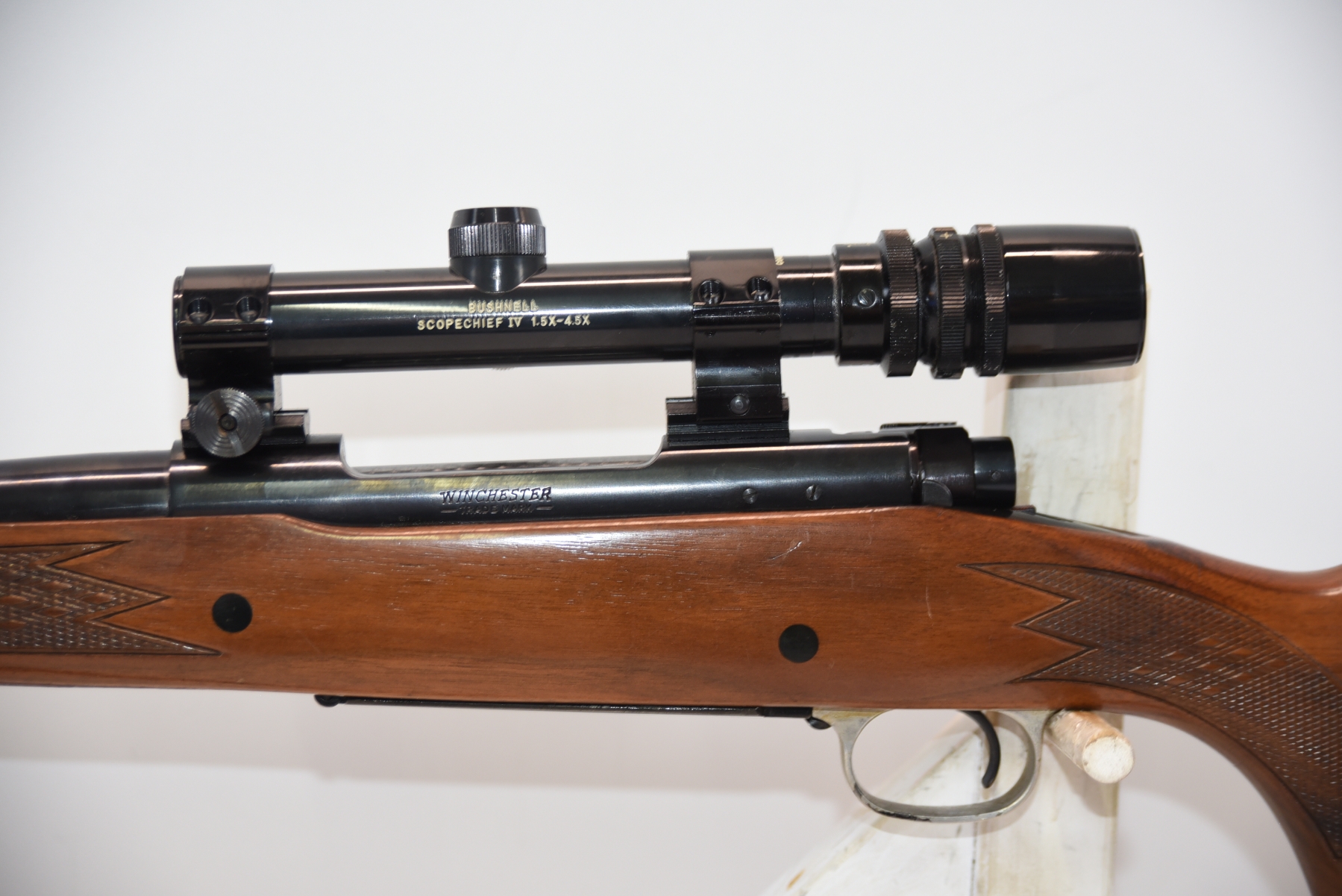 The wooden stock has a number of scratches and dents on both sides as well as the top and underneath. The wooden forearm has some scratches. The bluing is shiny and has some scratches. There is scratches and paint chipping on the trigger guard. Comes with a leather sling attached. Comes with a Bushnell Scopechief IV 1.5x - 4.5x attached. The scope is shiny but does have some scratching. Scope is clear to look through. Scope does not have any lens covers. The bore is shiny and does have visible rifling, in very good condition.