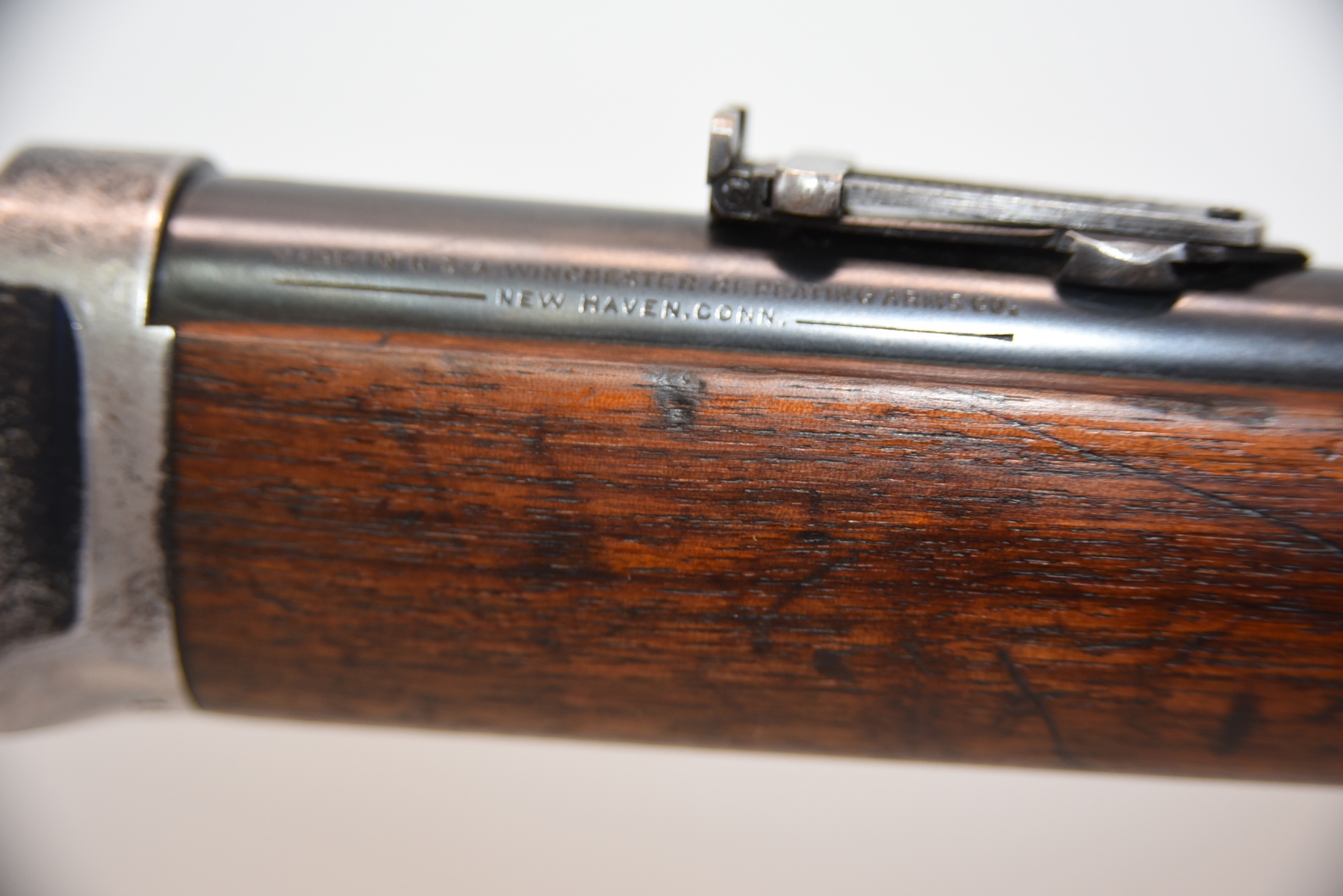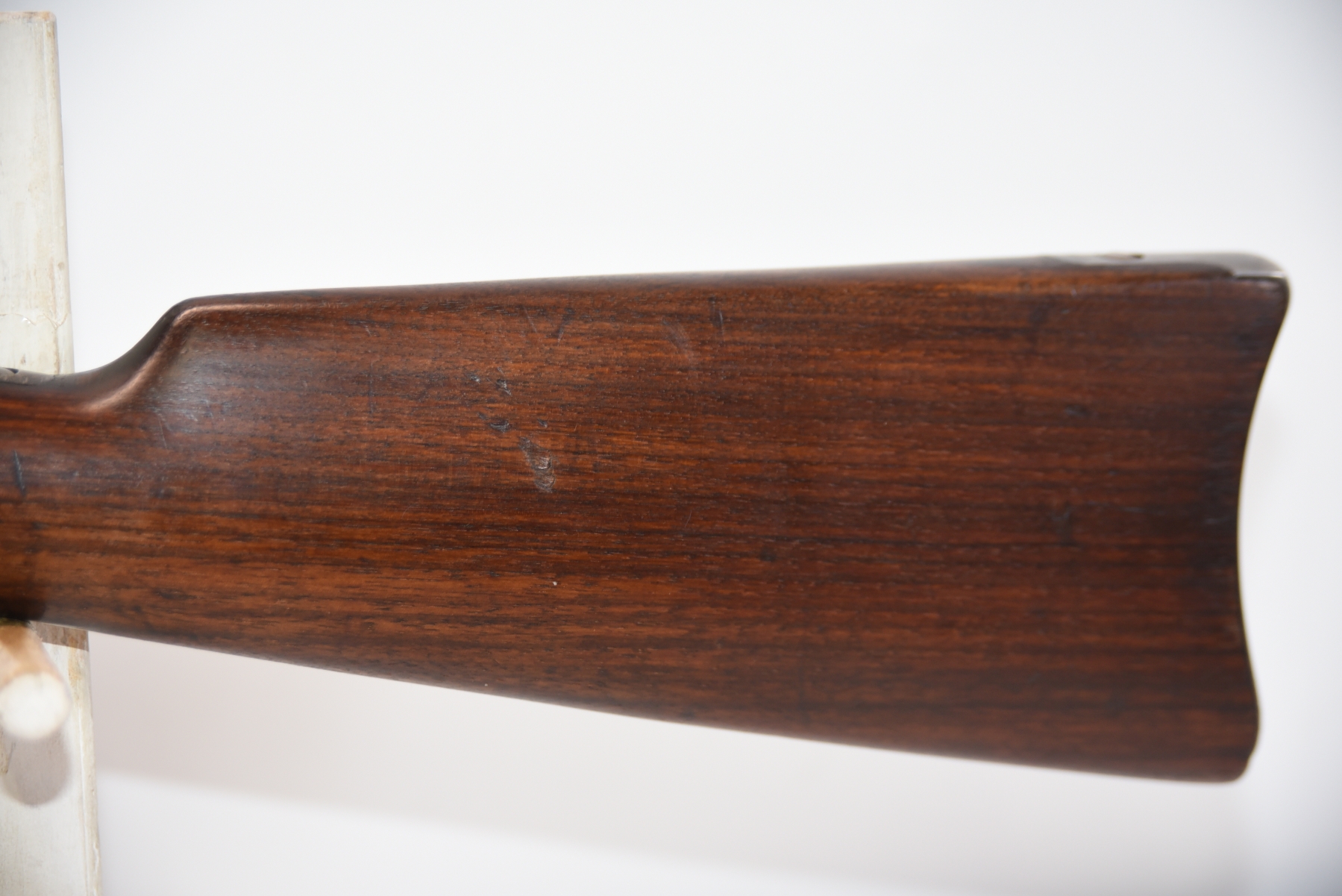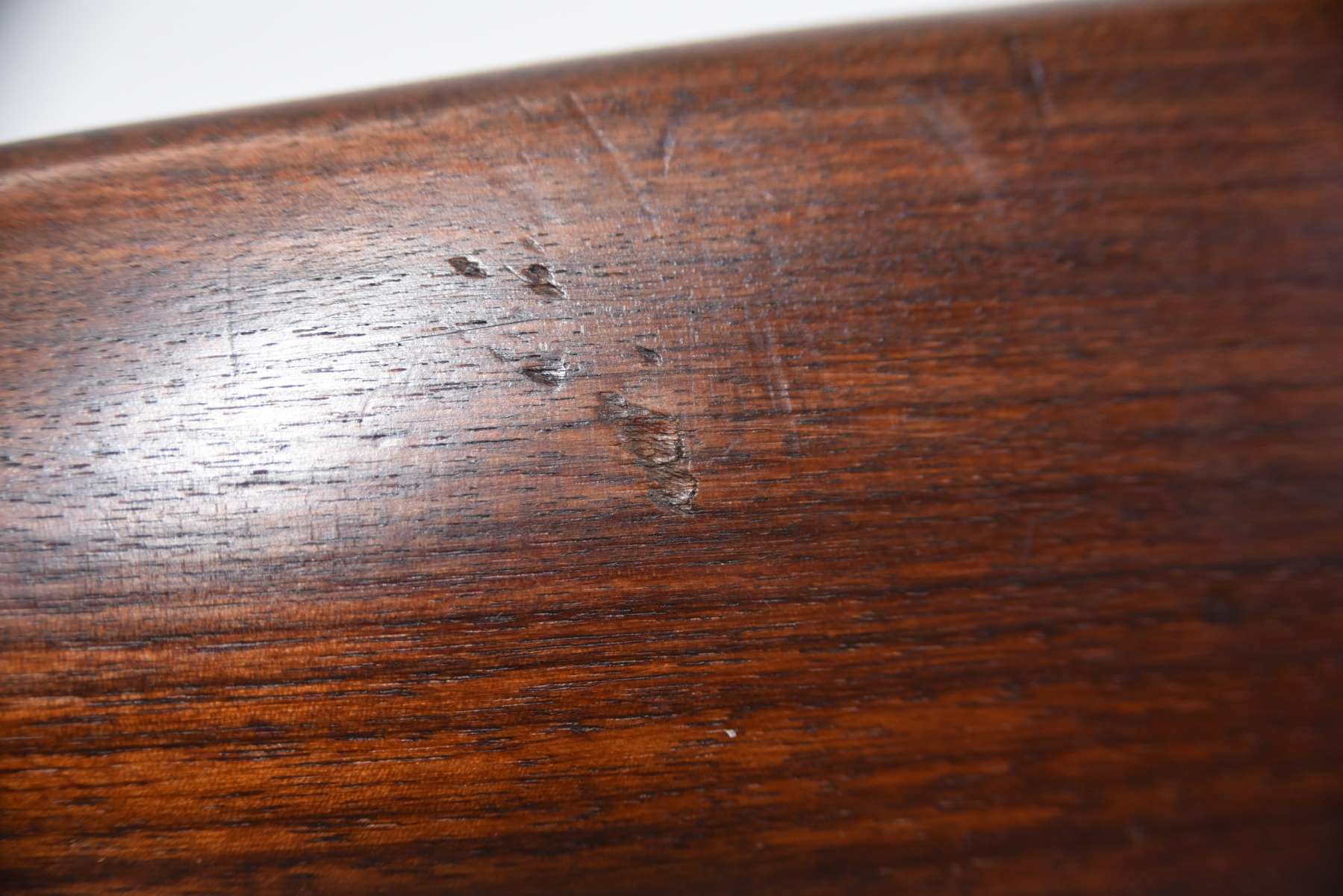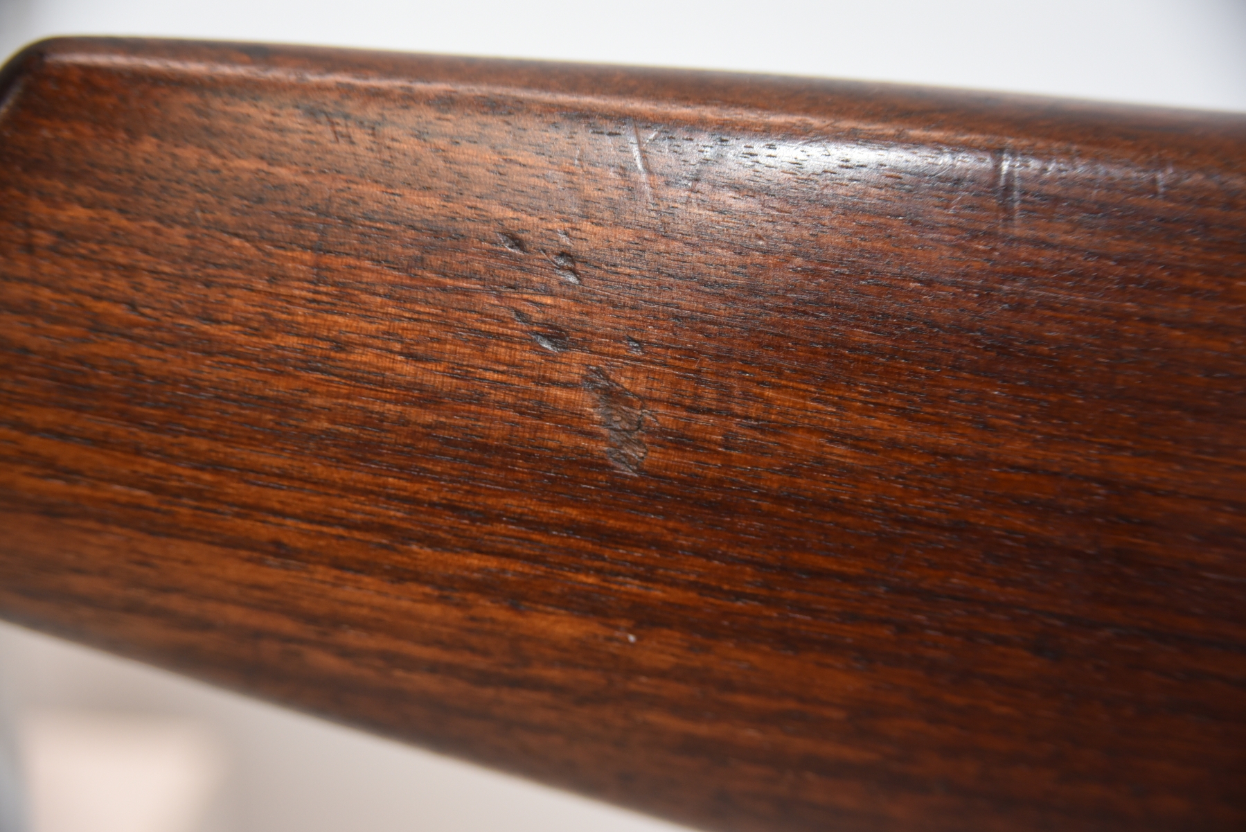 The wooden stock has a number of scratches and dents on both sides. The receiver has scratches and scuffs on both sides. Receiver does have a saddle ring attached. The wooden forearm has a number of scratches and dents on both sides. The shiny bluing does have scratches and greying on both sides. The bore is shiny with apparent rifling. Has a front sight and sigth elevator.
