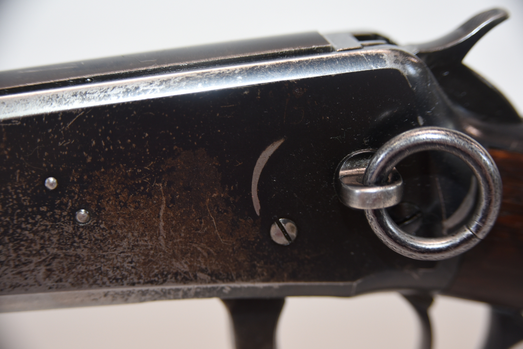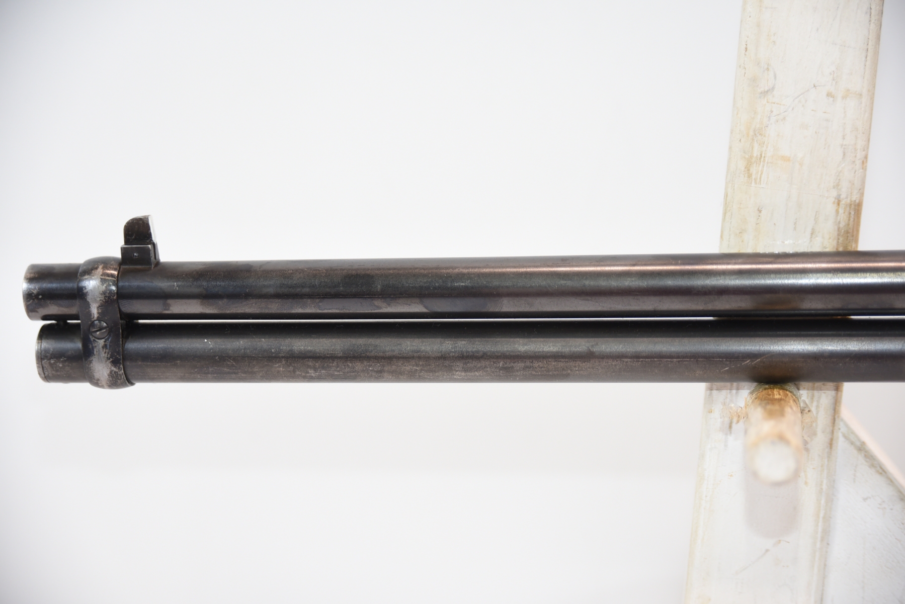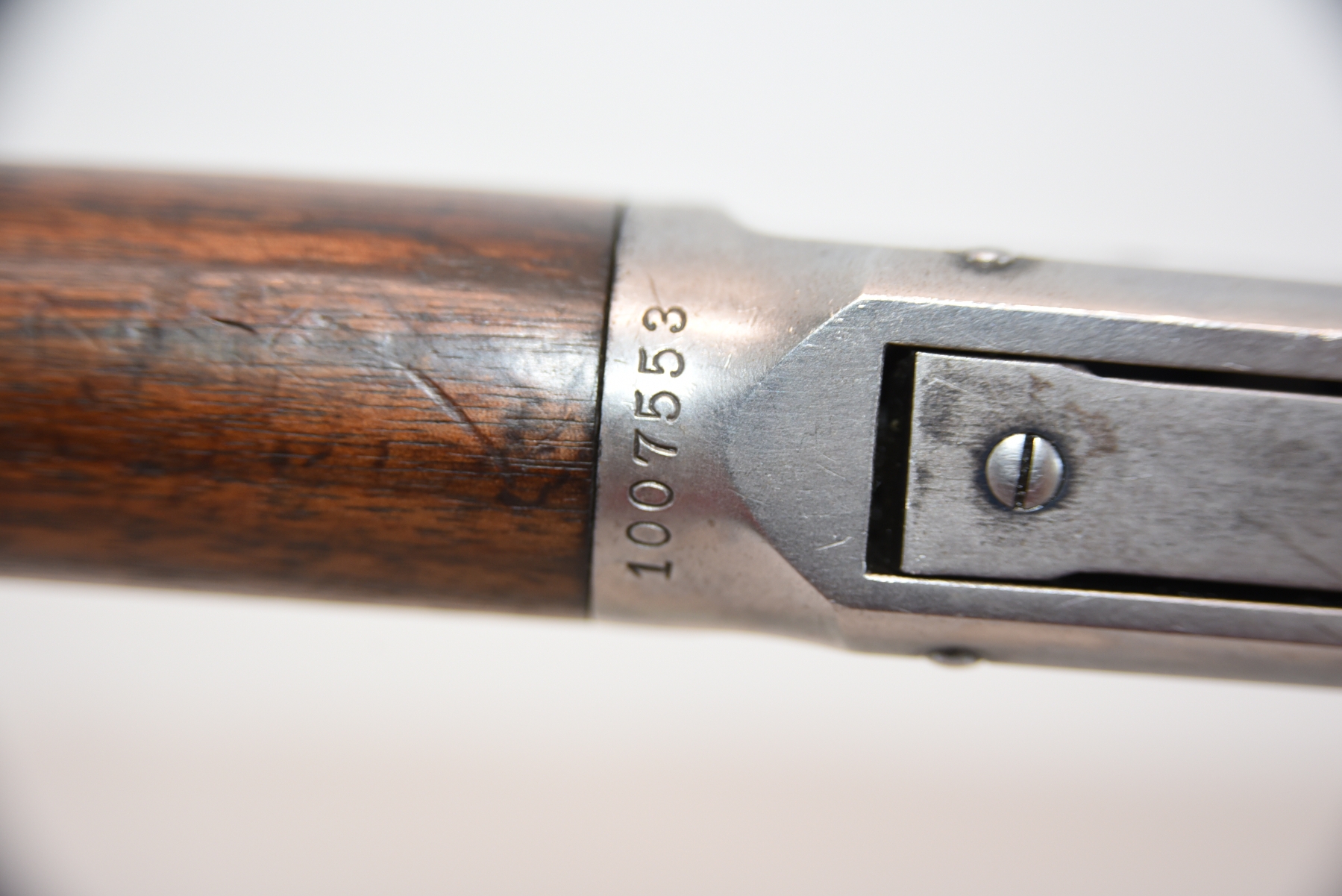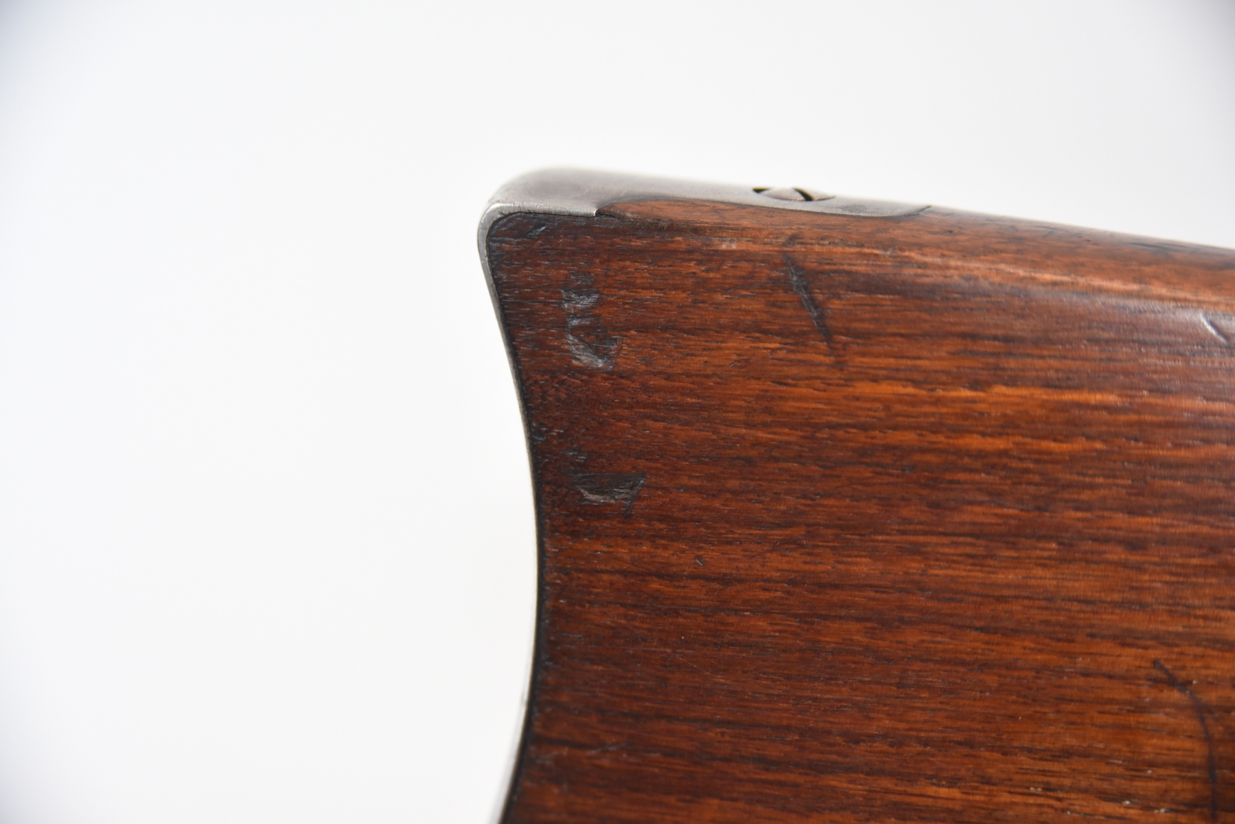 The wooden stock has a number of scratches and dents on both sides. The receiver has scratches and scuffs on both sides. Receiver does have a saddle ring attached. The wooden forearm has a number of scratches and dents on both sides. The shiny bluing does have scratches and greying on both sides. The bore is shiny with apparent rifling. Has a front sight and sigth elevator.