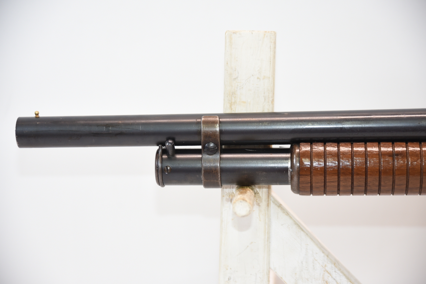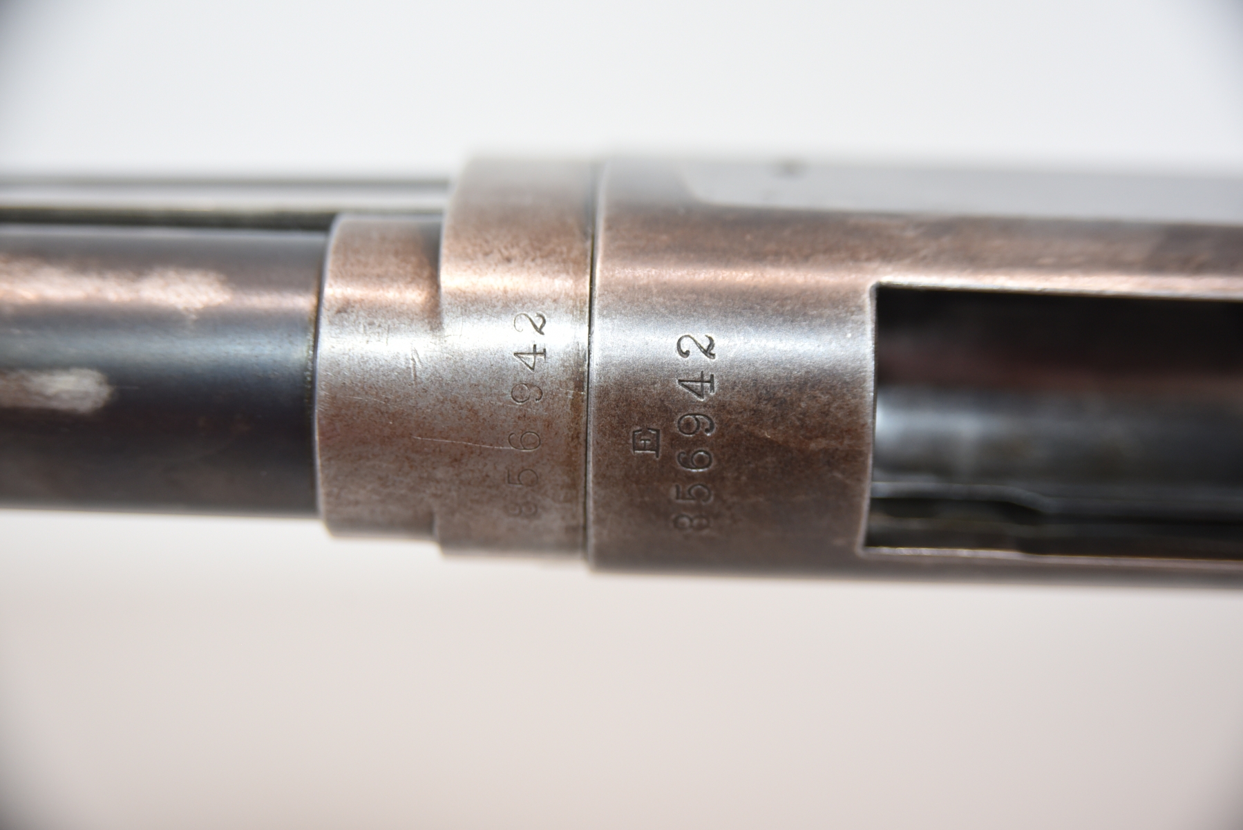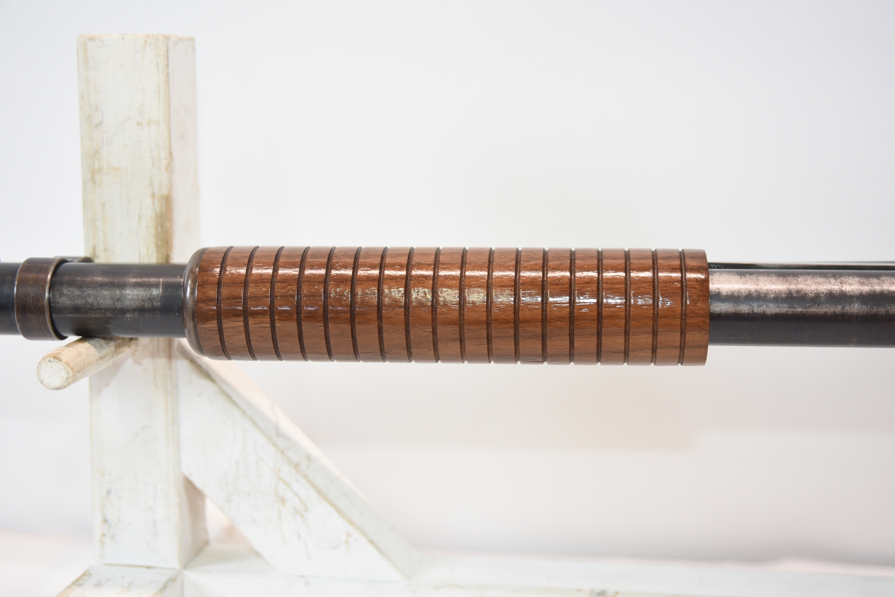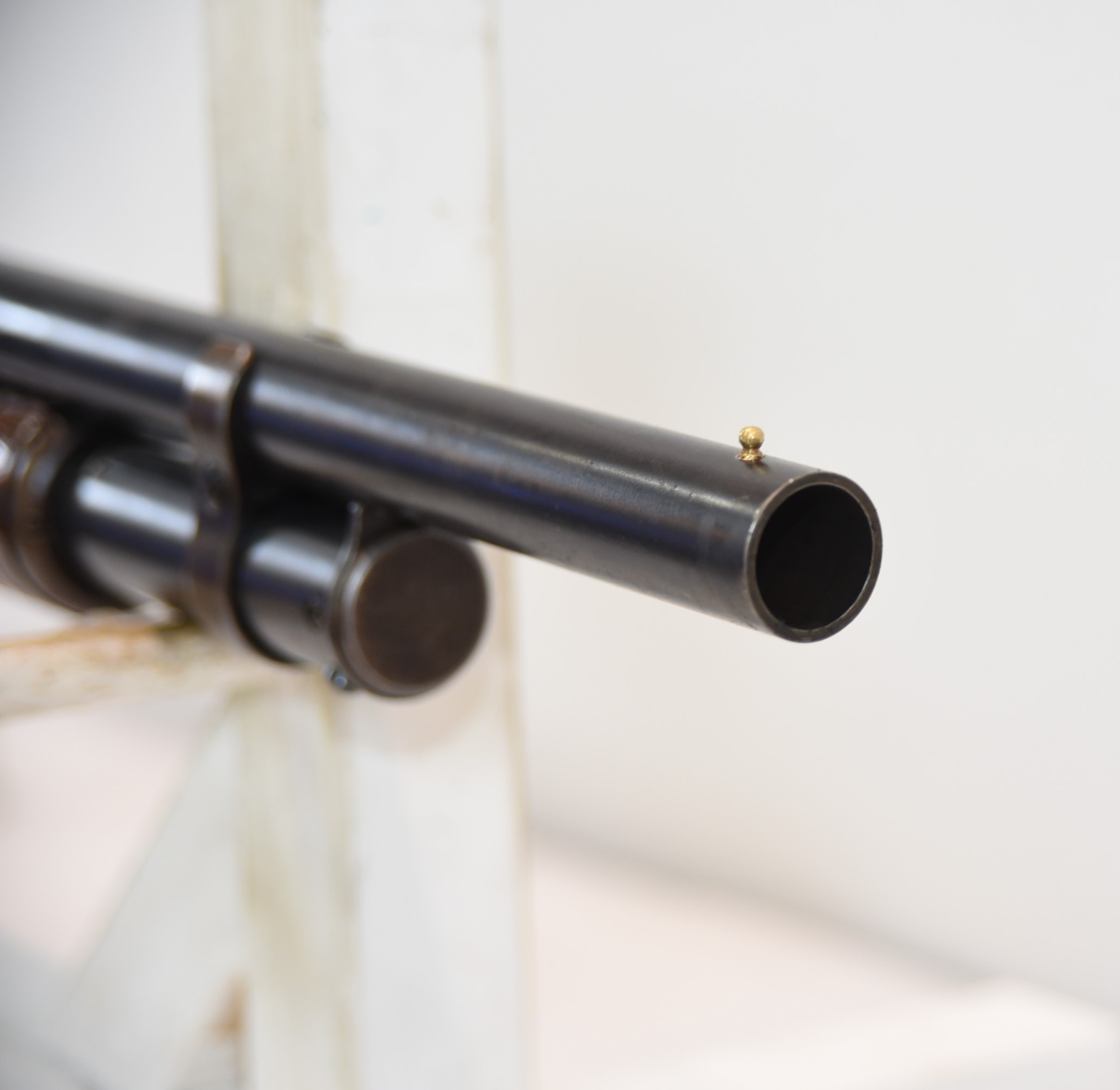 The wooden stock has a small minor scratch on the bottom left hand side. The receiver has scratches on both sides. The wooden forearm is in very good condition. The shiny bluing has scratching and greying on both sides. The bore is shiny and smooth. Equipped with a full choke.