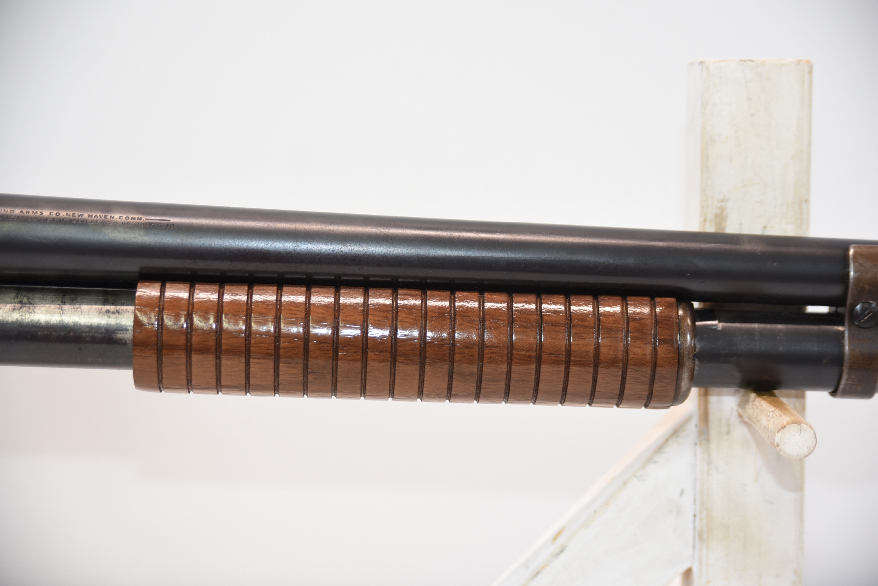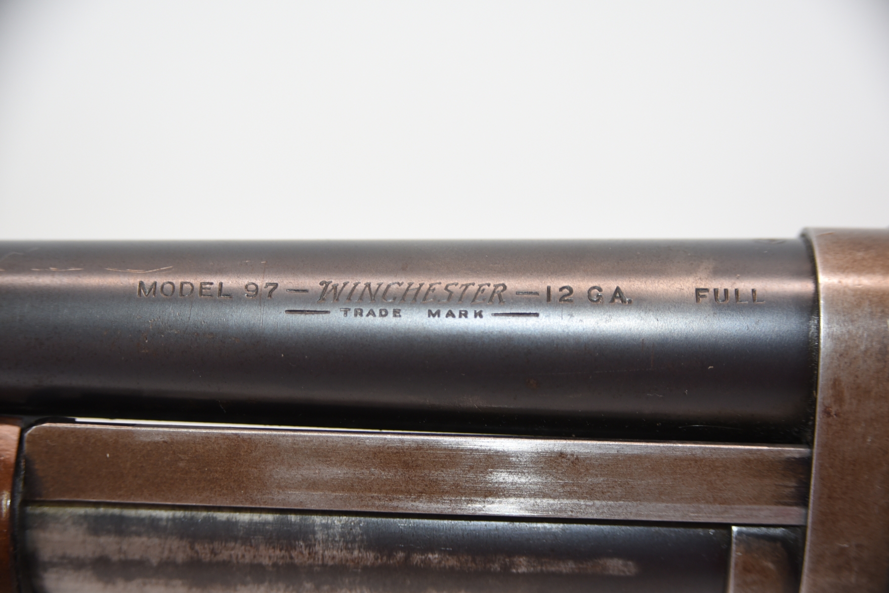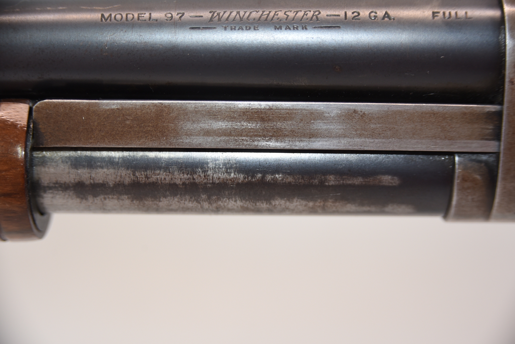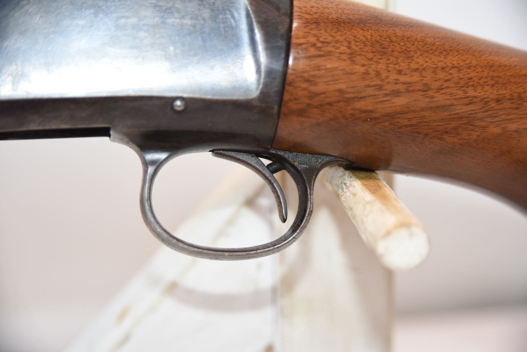 The wooden stock has a small minor scratch on the bottom left hand side. The receiver has scratches on both sides. The wooden forearm is in very good condition. The shiny bluing has scratching and greying on both sides. The bore is shiny and smooth. Equipped with a full choke.