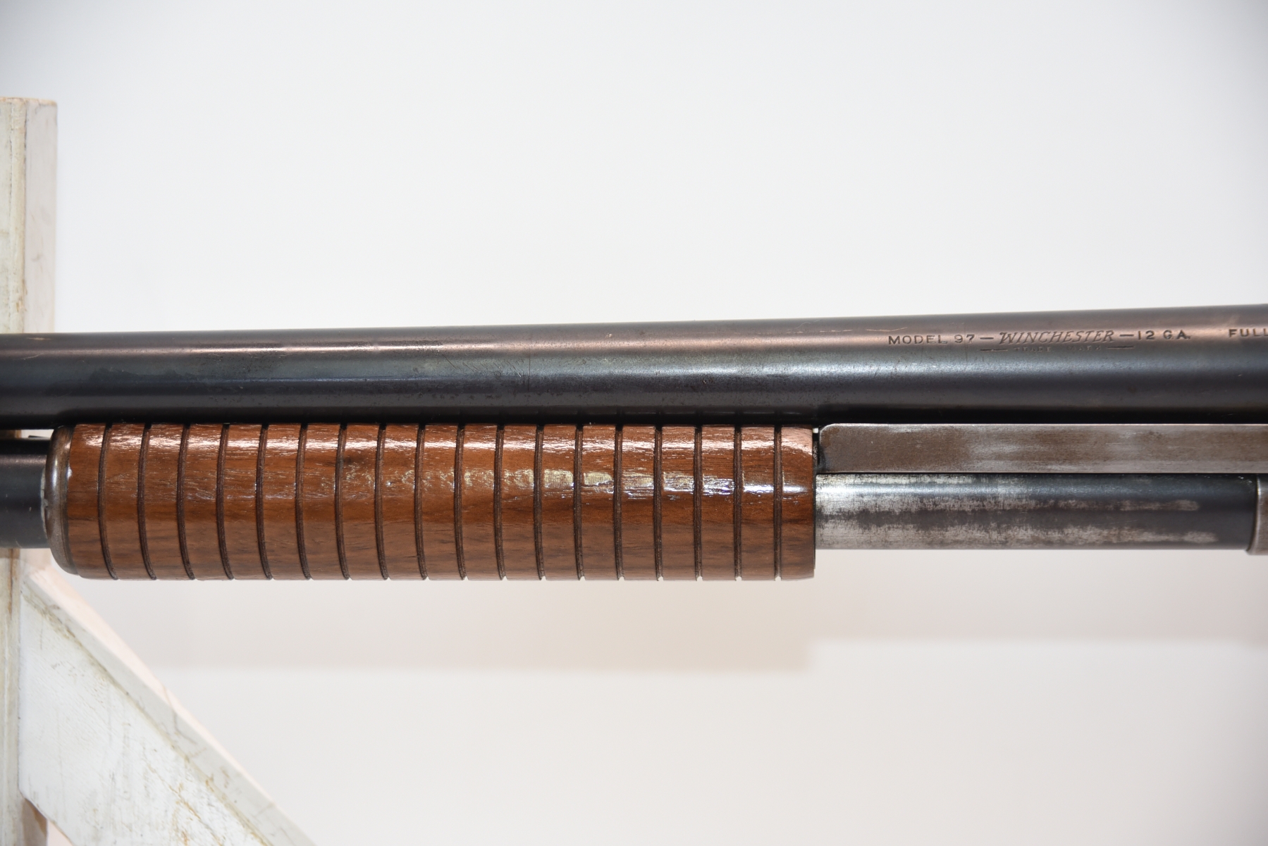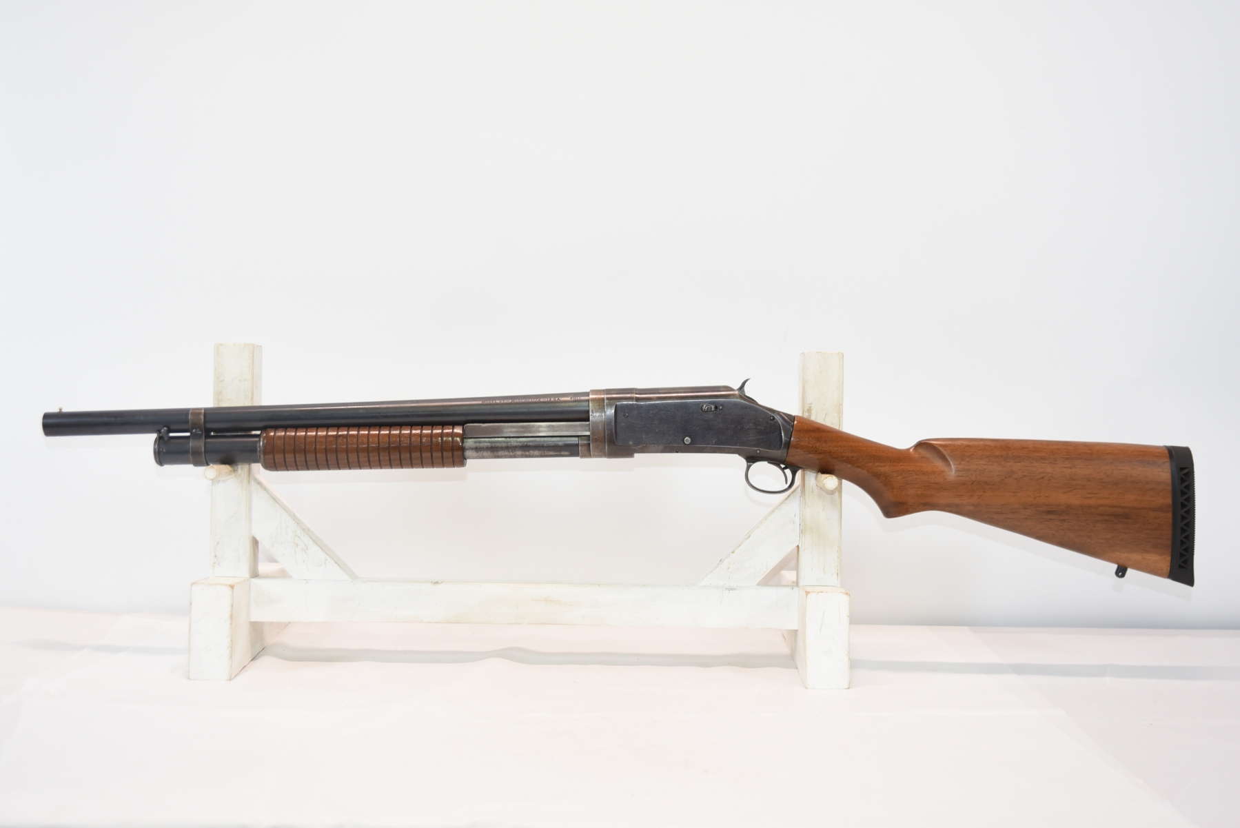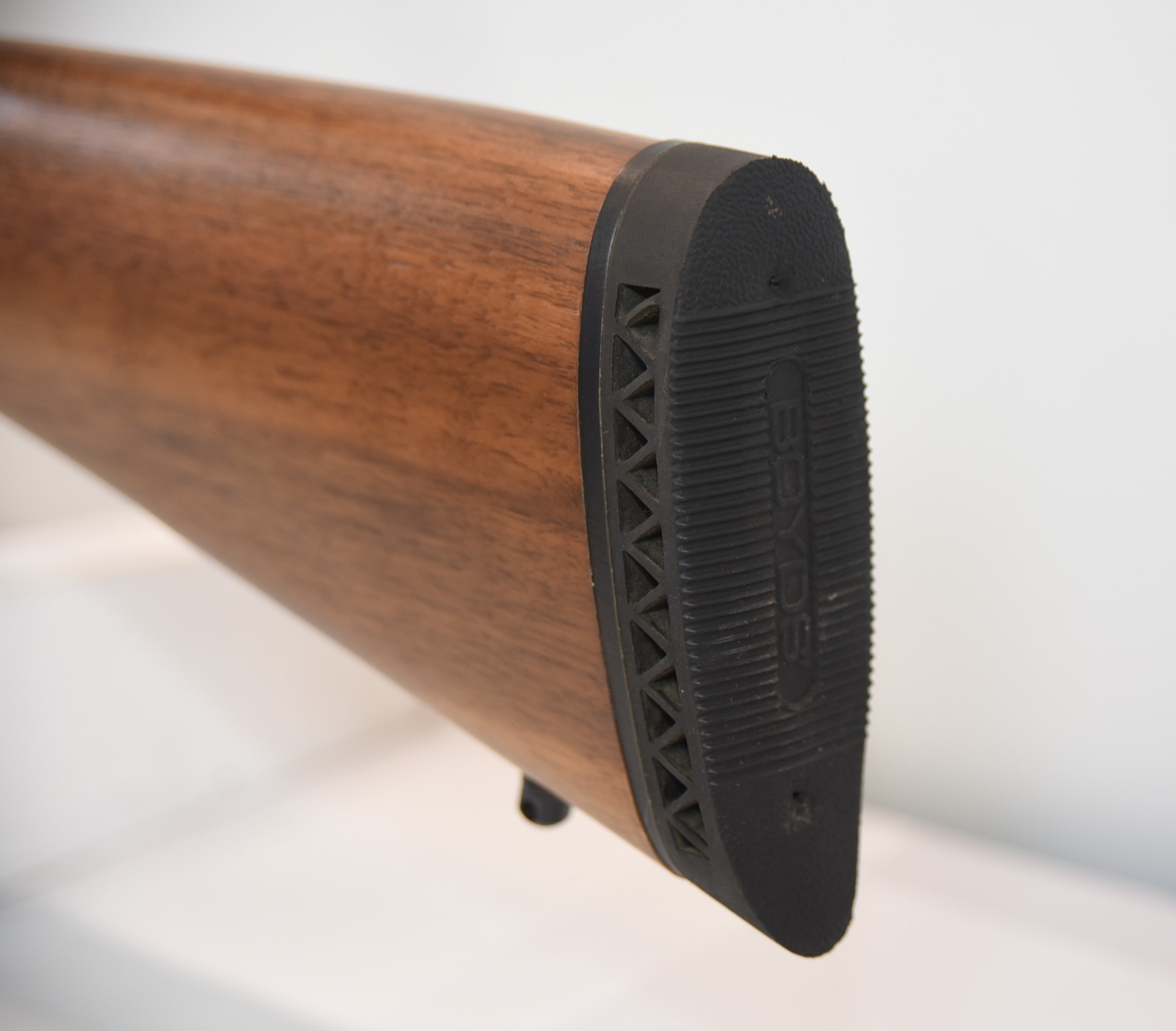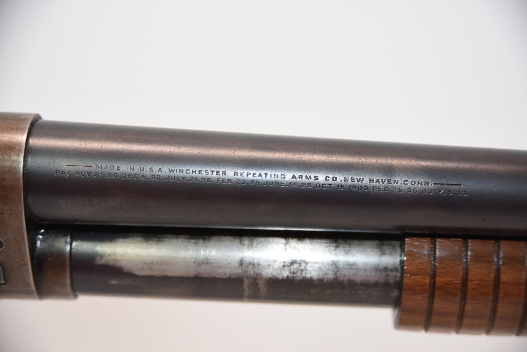 The wooden stock has a small minor scratch on the bottom left hand side. The receiver has scratches on both sides. The wooden forearm is in very good condition. The shiny bluing has scratching and greying on both sides. The bore is shiny and smooth. Equipped with a full choke.