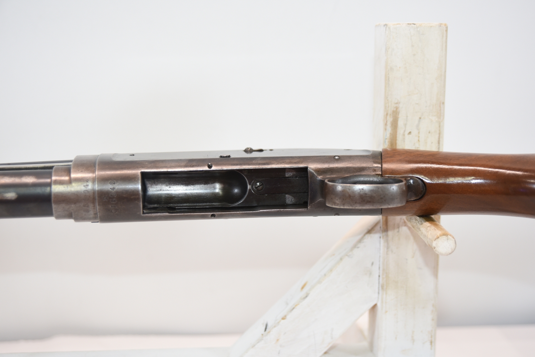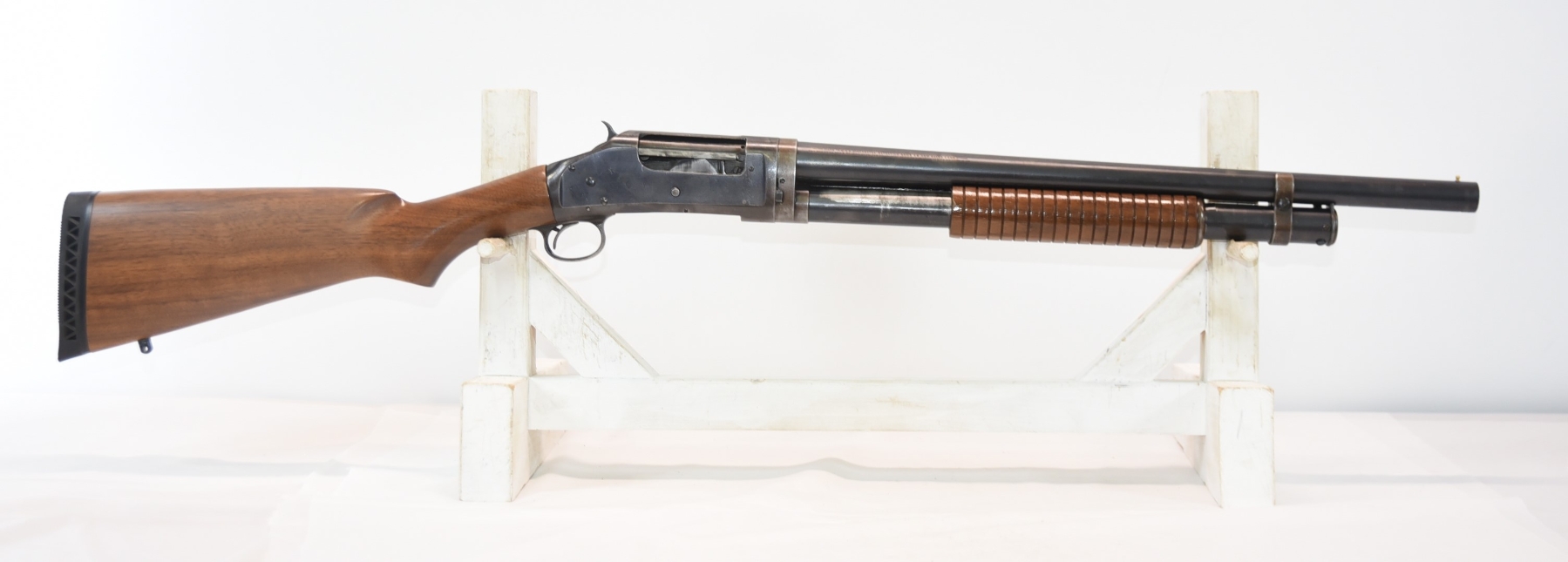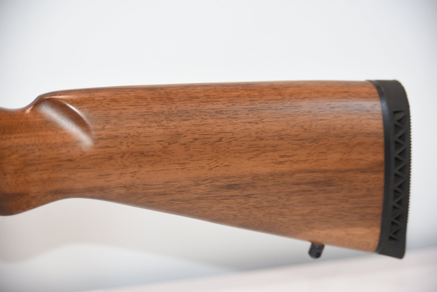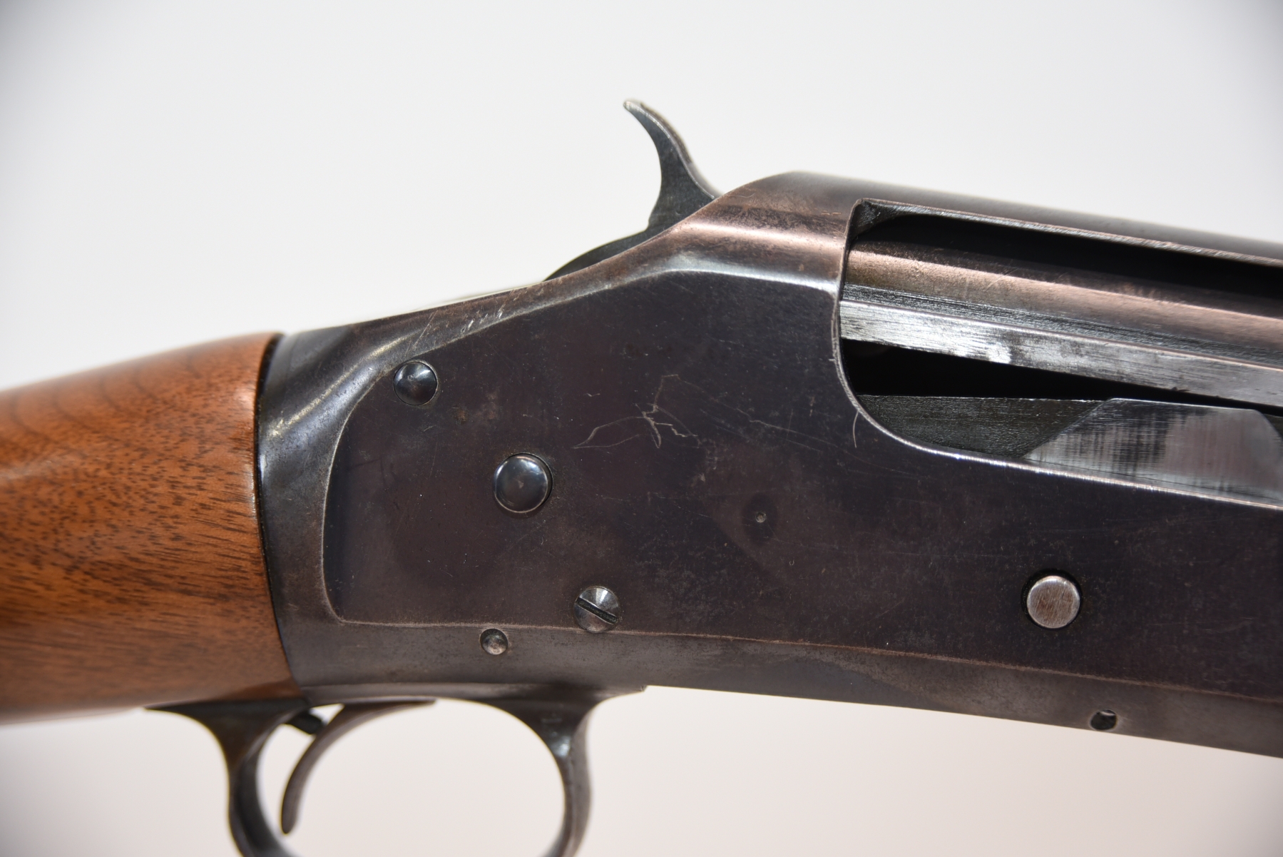 The wooden stock has a small minor scratch on the bottom left hand side. The receiver has scratches on both sides. The wooden forearm is in very good condition. The shiny bluing has scratching and greying on both sides. The bore is shiny and smooth. Equipped with a full choke.