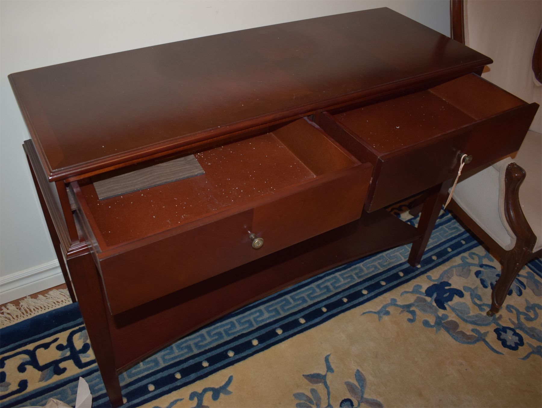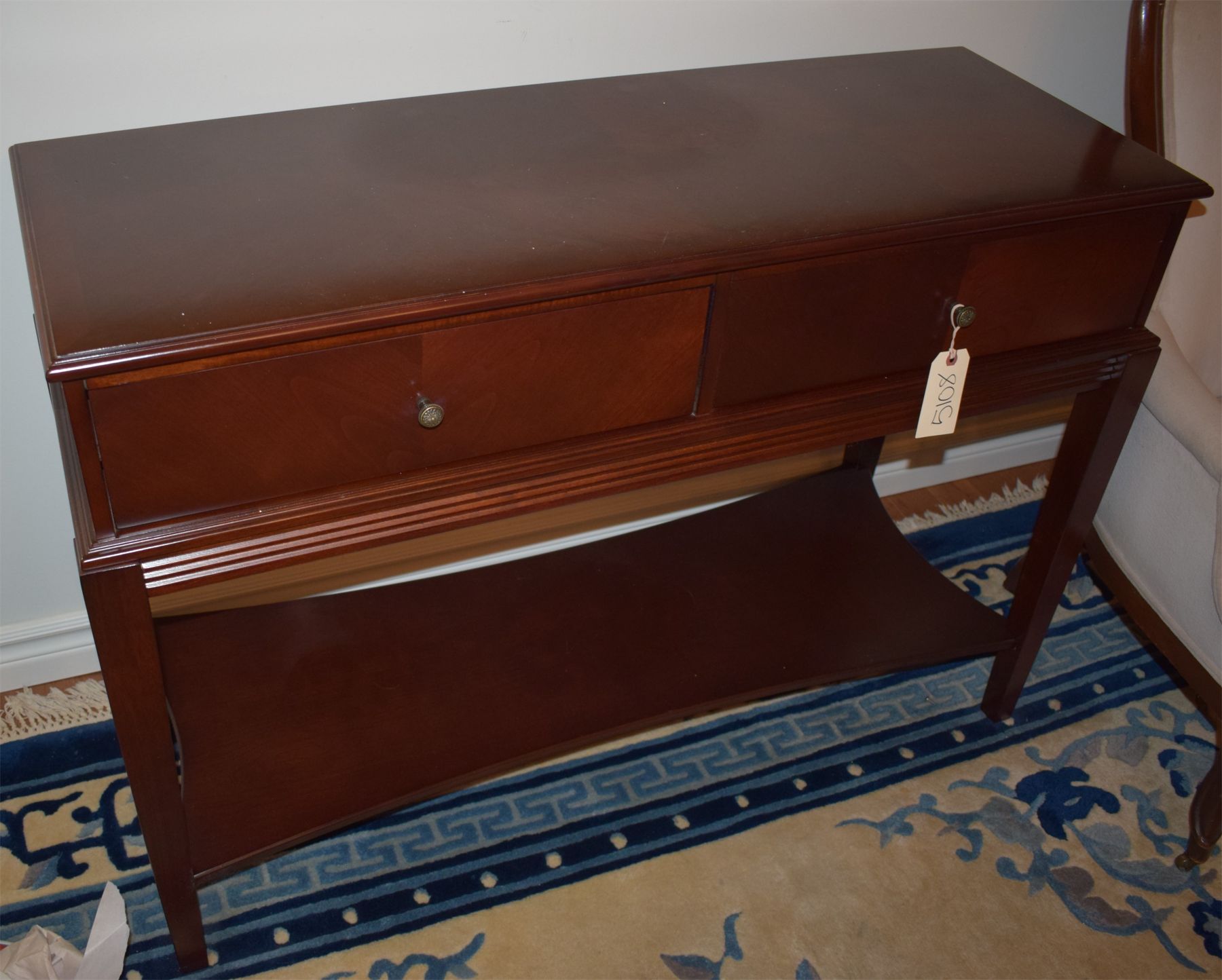 2-drawer table 15.5" deep x 44" wide x 31.5" high. There is also a bottom shelf.