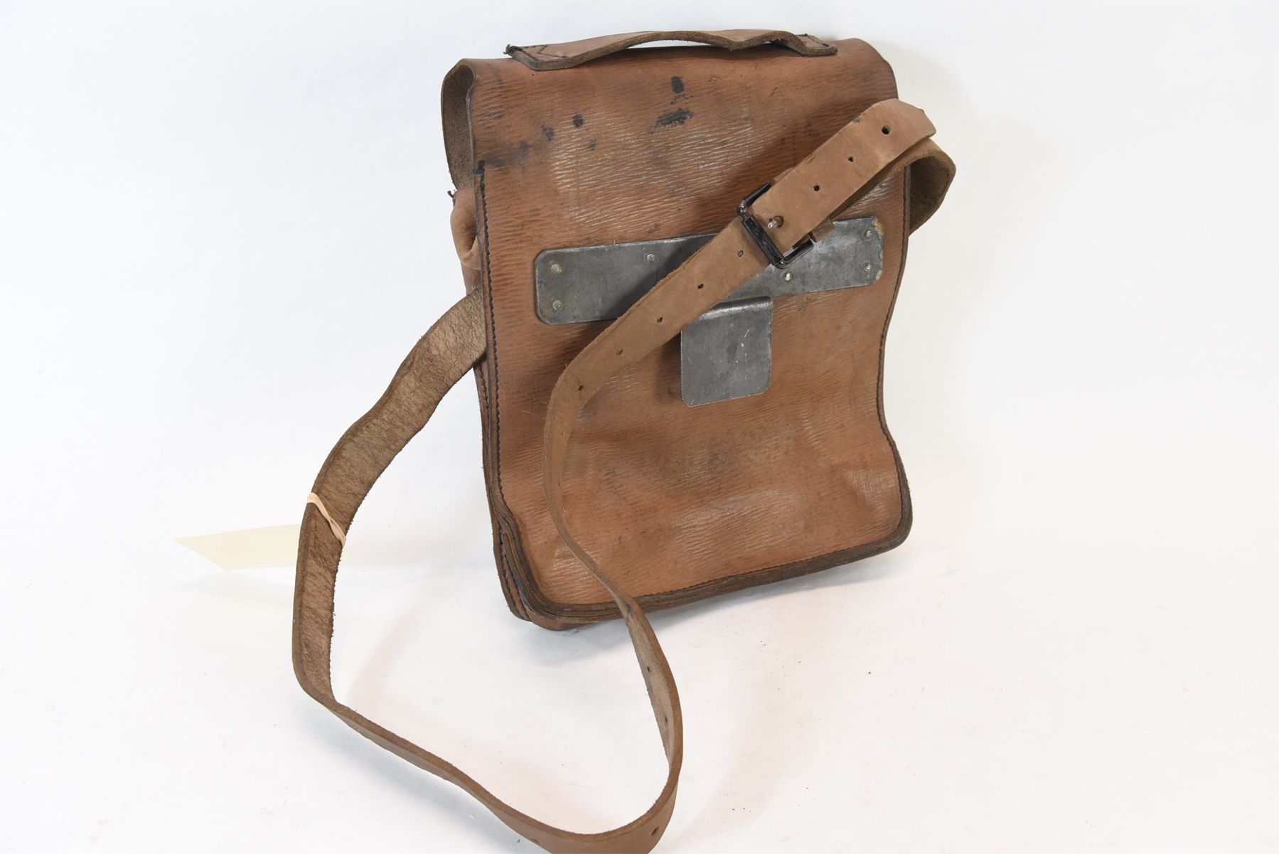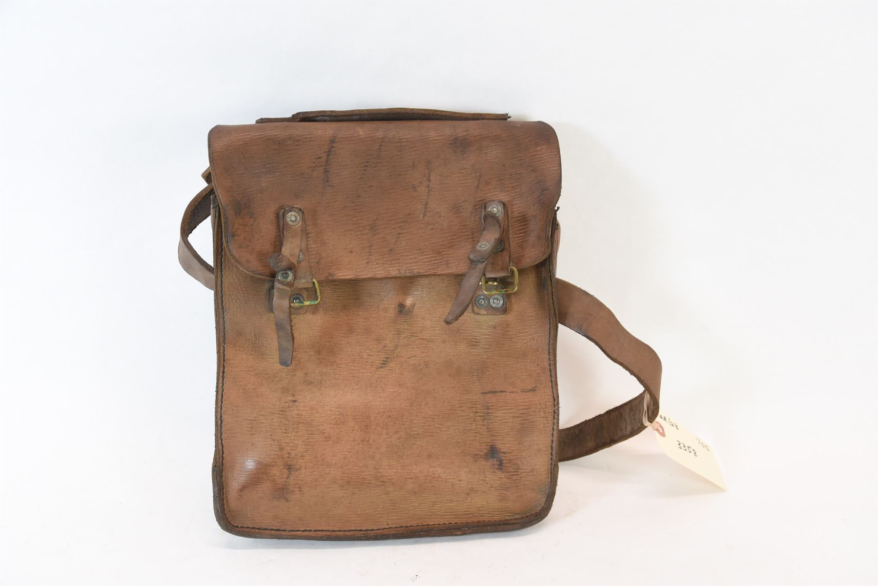 Made by S. Norton of Oldham, England. The back has a plate that suggests it was a panier bag of some description perhaps for a motorcycle or bicycle. It is hand stitched and copper riveted throughout. Inscribed on the inside flap is CDN 548 / Lieut. John E. O. Davies / Aldershot England / May 26/44.