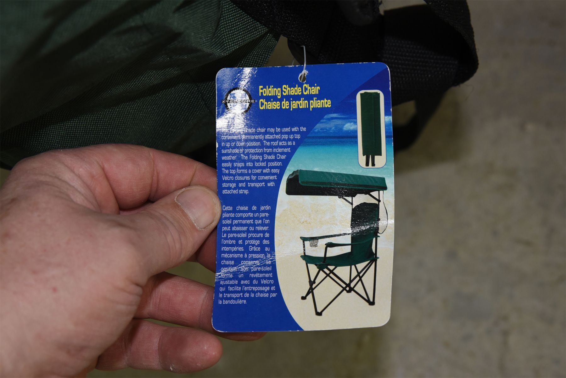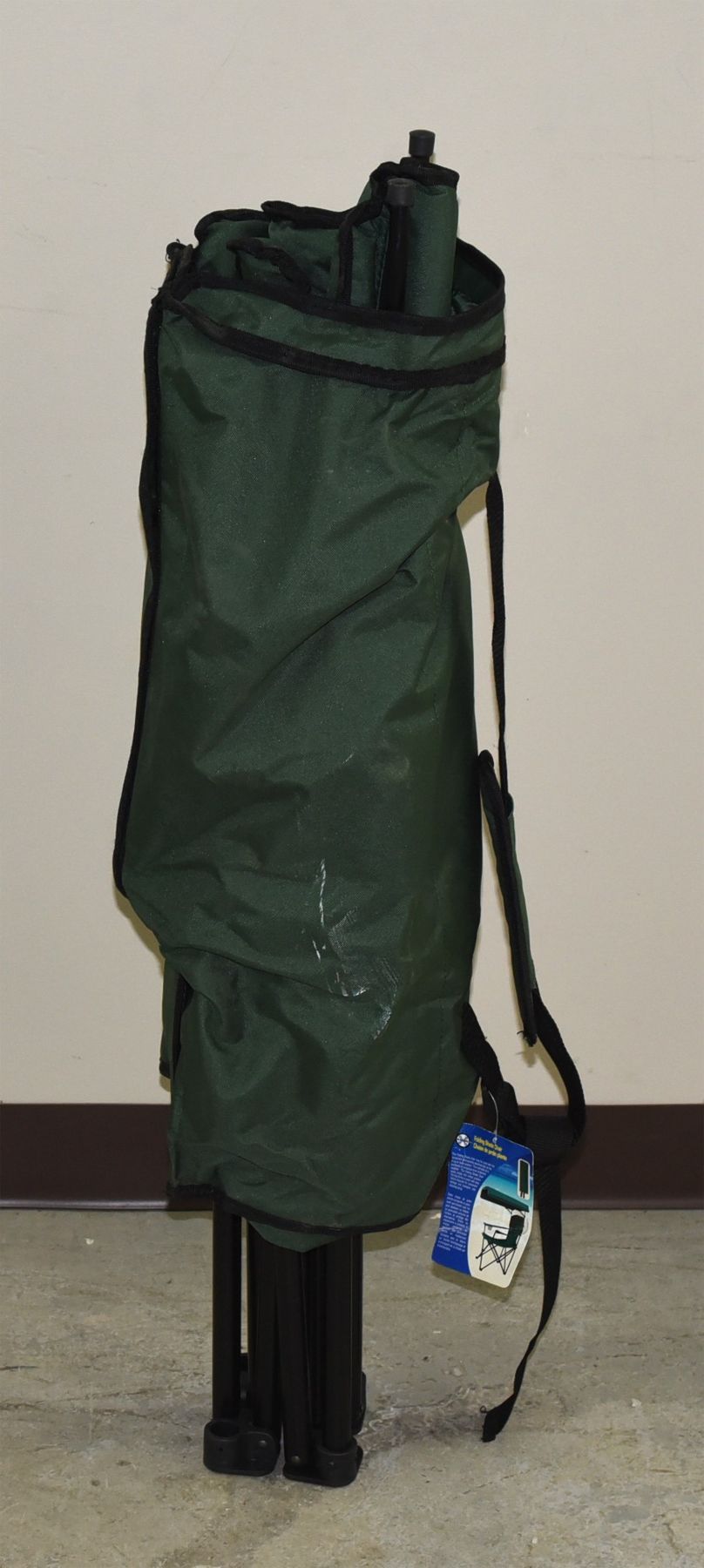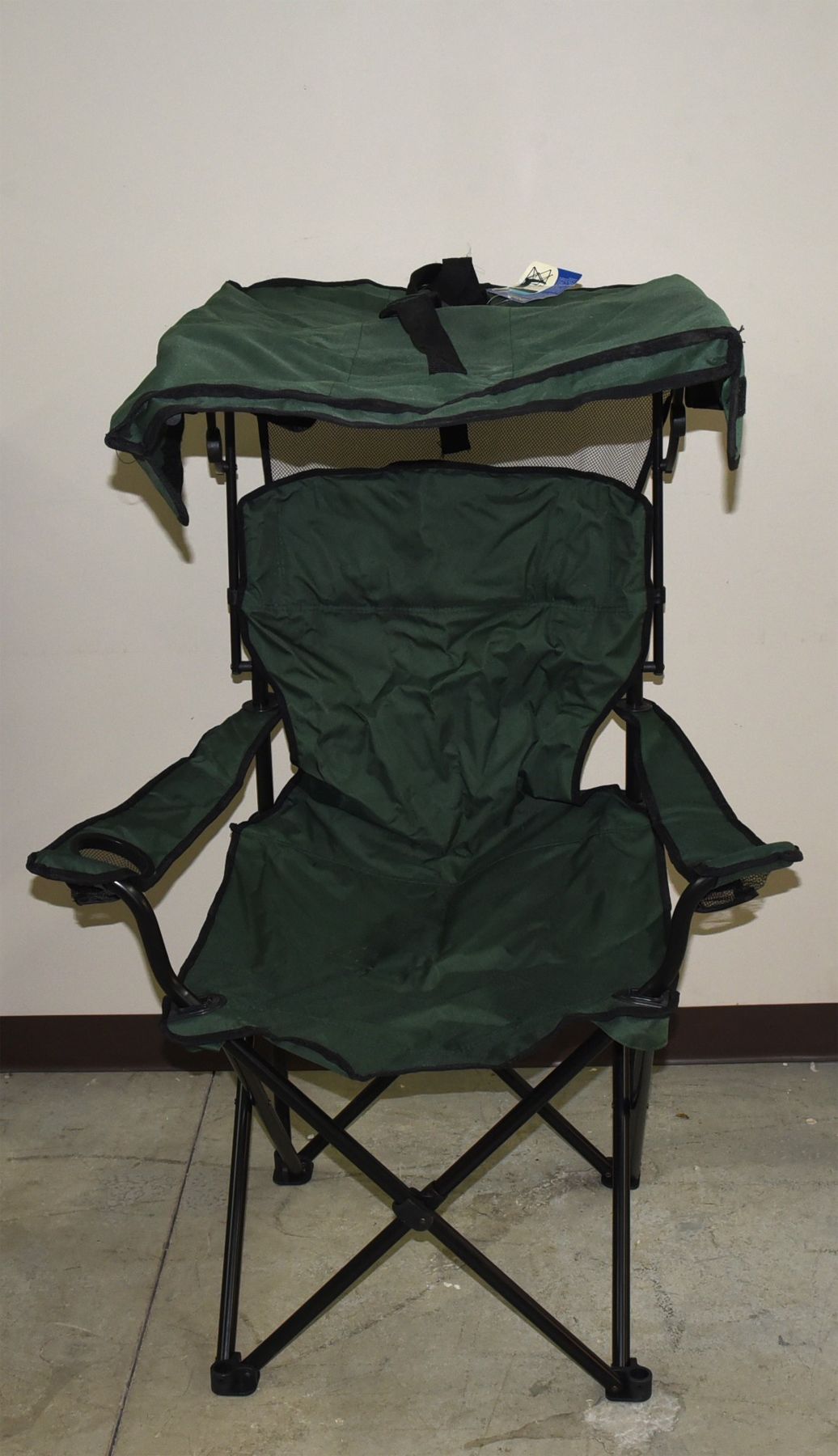Dark green camping chair with beverage holder and folding cover for protection from sun and rain. Canopy doubles as carrying case. Stain and moisture-resistant fabric with cup holders. Suitable for camping, fishing, the beach, leisure time at the garden.